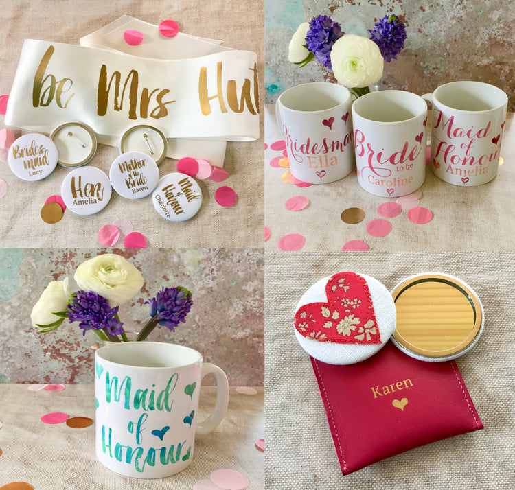 Badges to match our sashes, personalised pocket mirrors, keepsakes, party bags, mugs and more