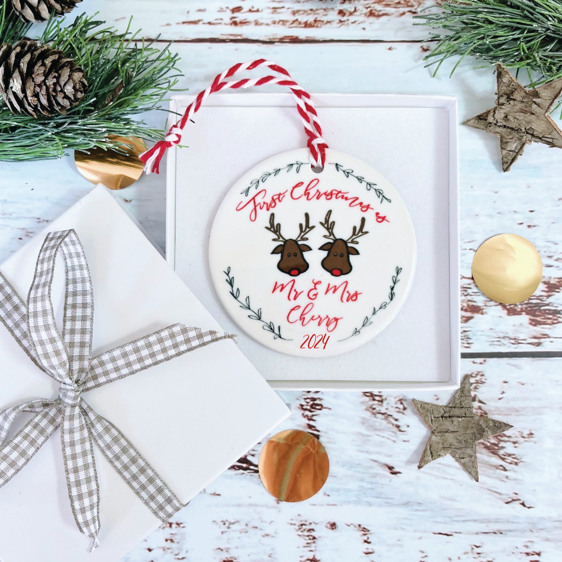 This cute reindeer design is a lovely way to mark a couple 1st Christmas together as husband and wife. You can personalise the decoration with the couples surname if you wish, which we will print in our elegant script font within the message 'First Christmas as Mr & Mrs [Surname] 2024, around our hand drawn reindeer characters. If you prefer we can leave the message as just 'Mr & Mrs', rather than specify the surname.