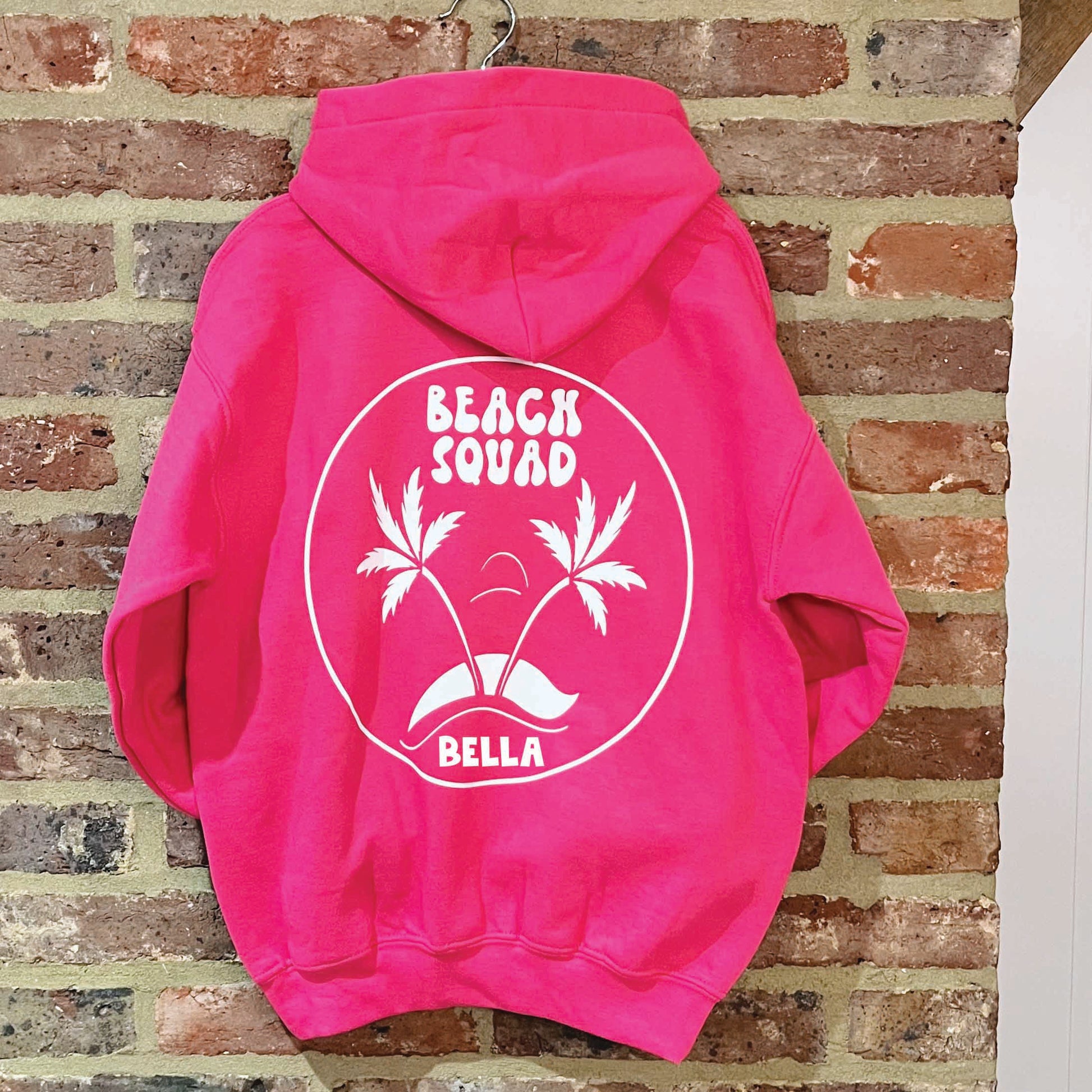 Be part of the Beach Squad! Cool and Comfy Hoody with a Beach Squad palm tree design printed on the back in white. If you wish you can personalise with a name at the base of the design. Available in a range of colours, great for kids and adults alike.