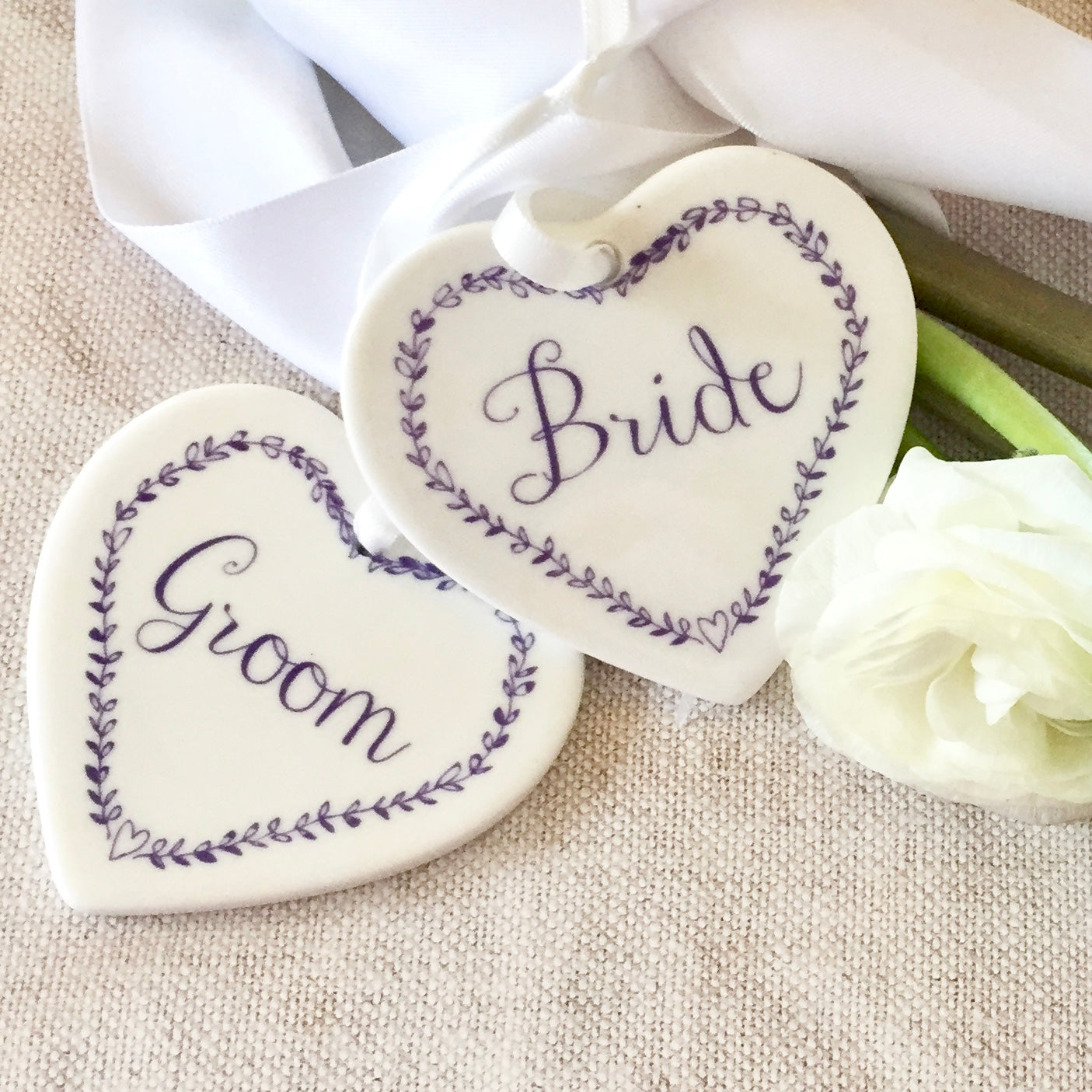 A beautiful set of two white ceramic hearts for the bride and groom. These make beautiful place name settings, or keepsakes for the bride and groom on their special day.