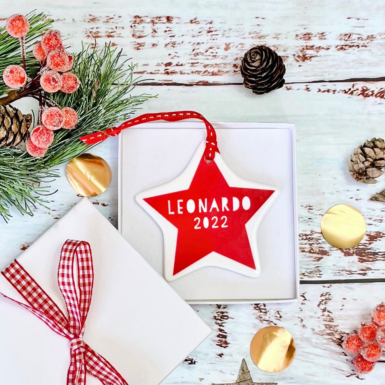 These Star shaped tree decorations are made from white ceramic, and feature your choice of name, printed centrally on the star in our modern papercut style font , with the year (2022) just below.