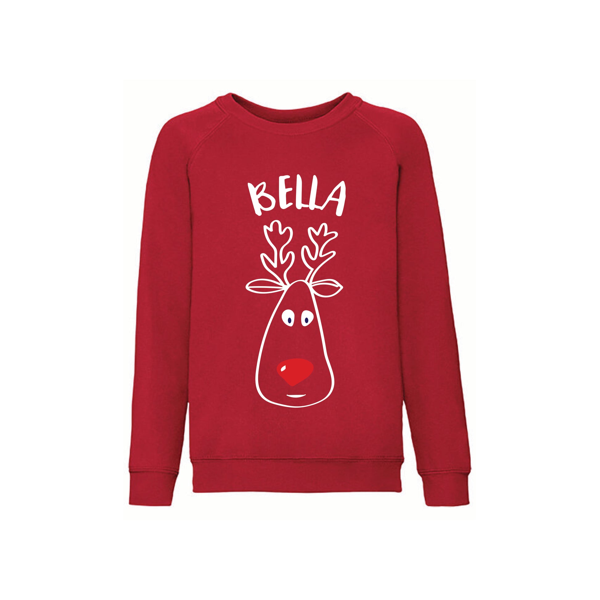 Personalised Christmas Jumpers to capture the Magic of Christmas. Our cute cartoon reindeer design is personalised with the recipients name, printed in white and is perfect for all the family.