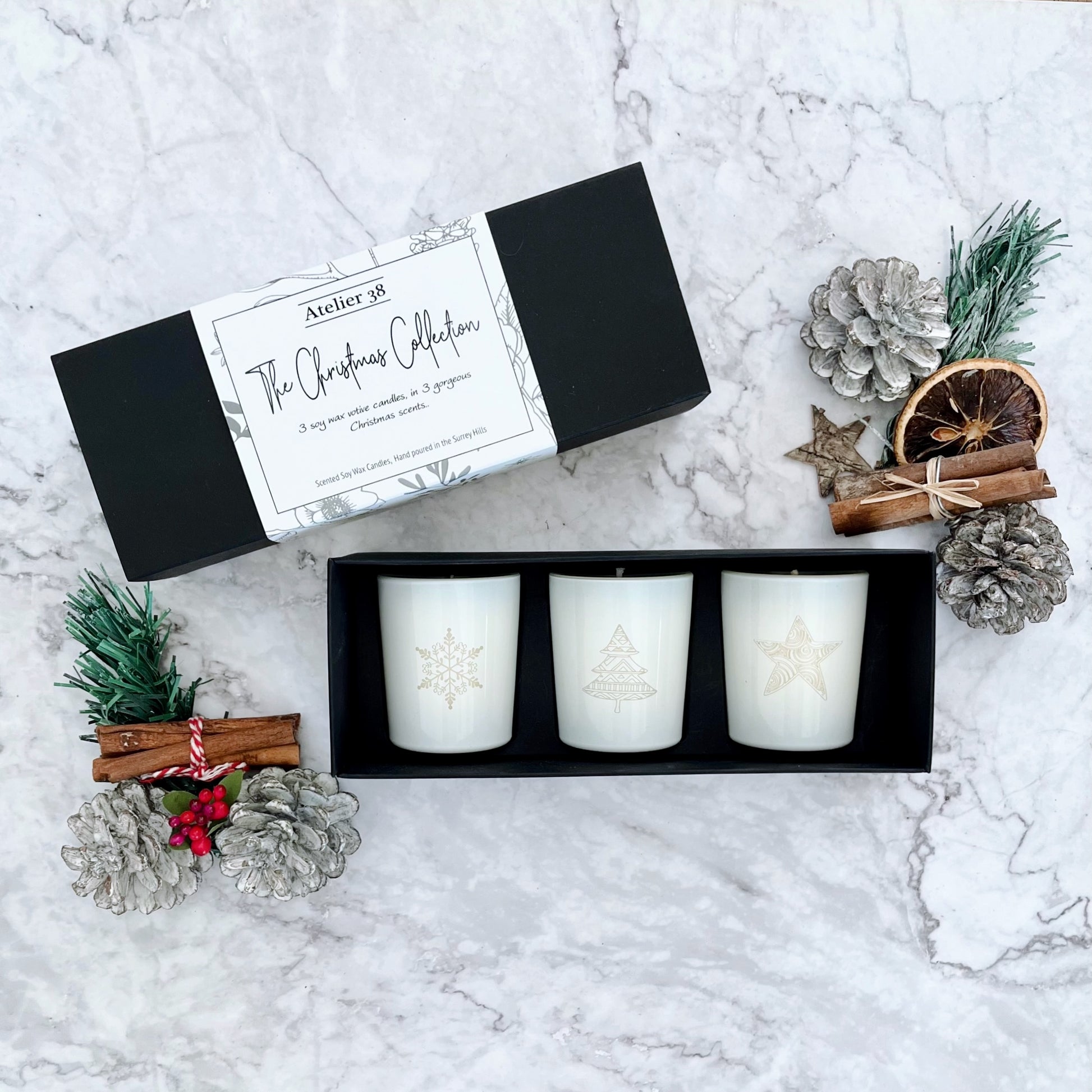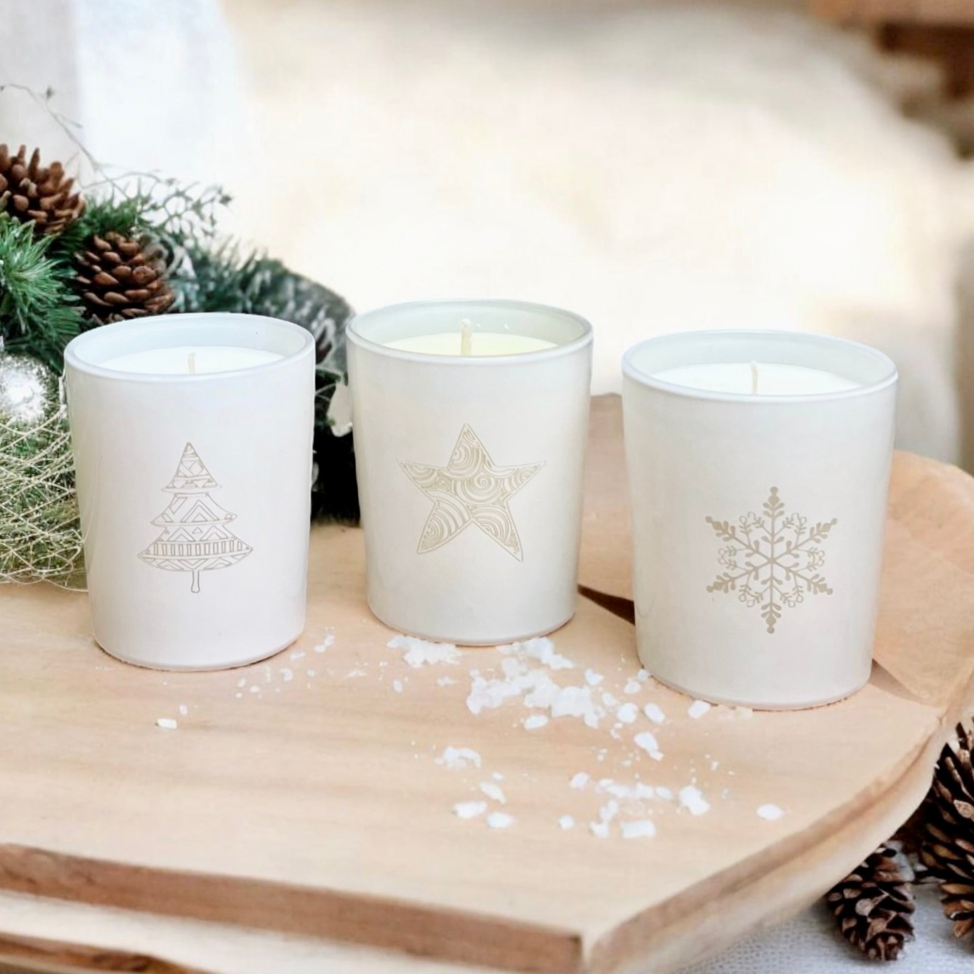 A beautiful gift box containing 3 white votive candles in 3 of our gorgeous Christmas Scents. The candle jars are delicately engraved with a star, a tree and a snowflake and not only look beautiful, but as the candles burn the light glows through the design. This set makes an ideal gift, or is the perfect way to sample several Christmas scents at once.