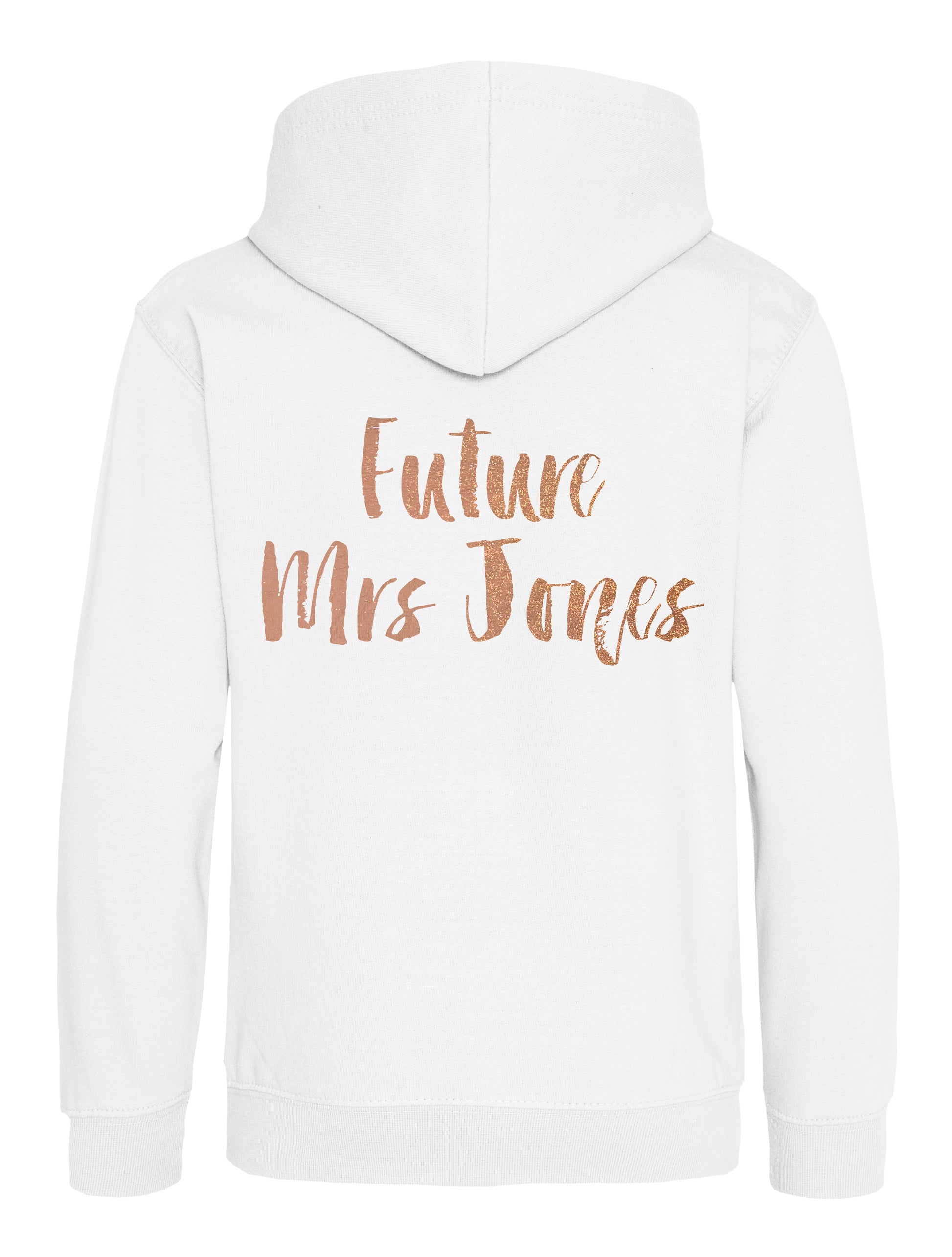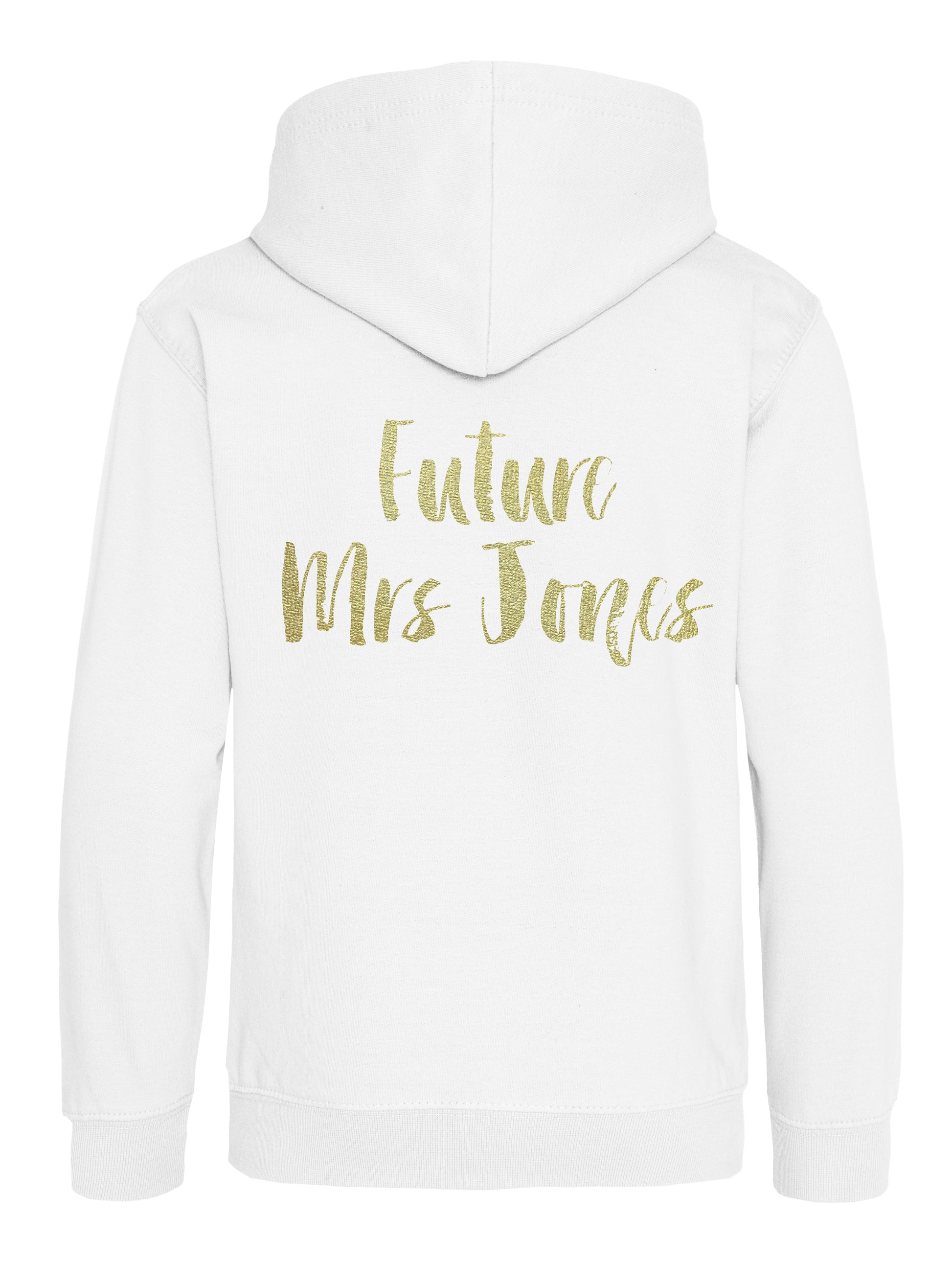 Beautiful soft white hoodies for the bride to be, perfect for Hen parties and celebrations in the run up to the big day. Choose from 3 beautiful metallic prints - Gold, Silver or Rose Gold.