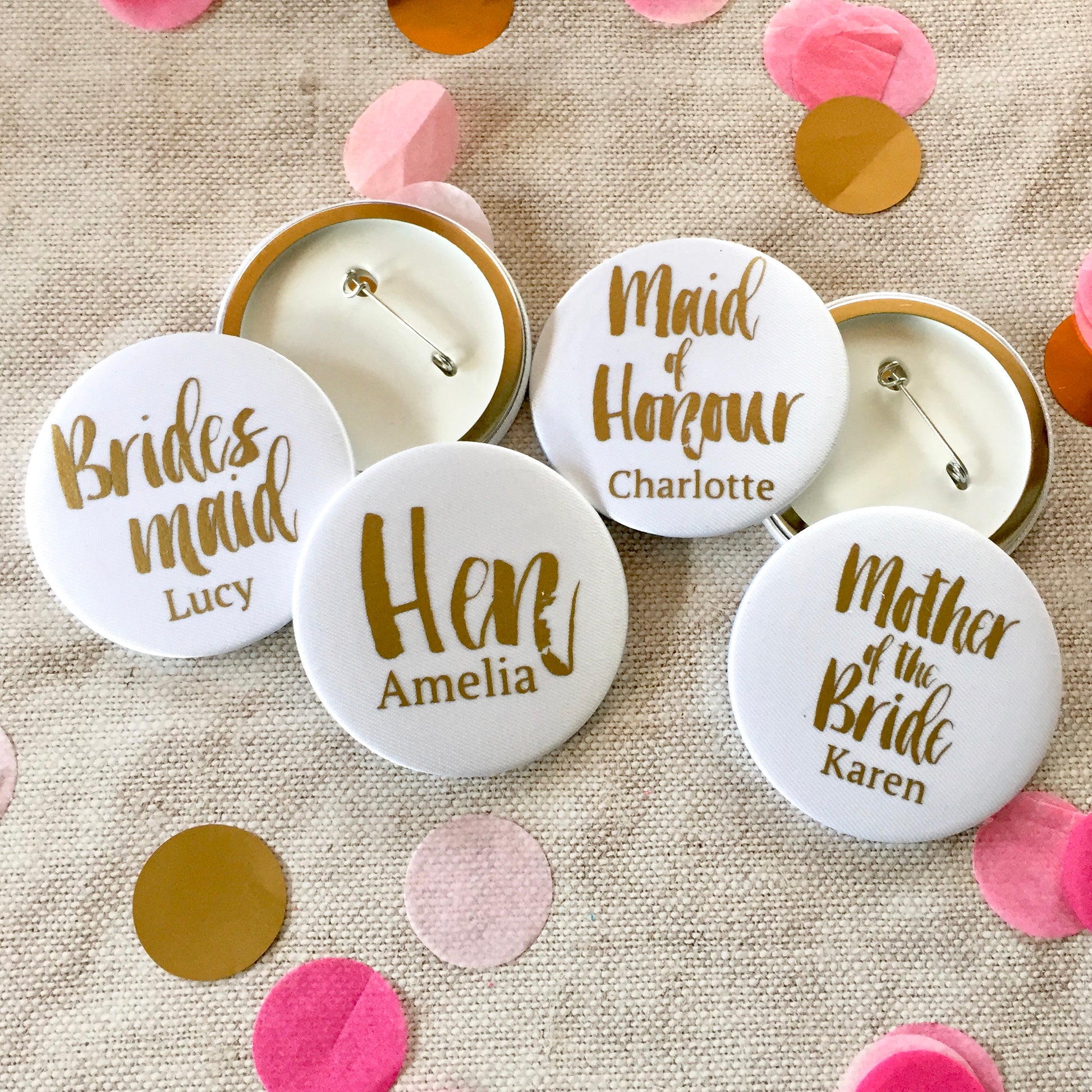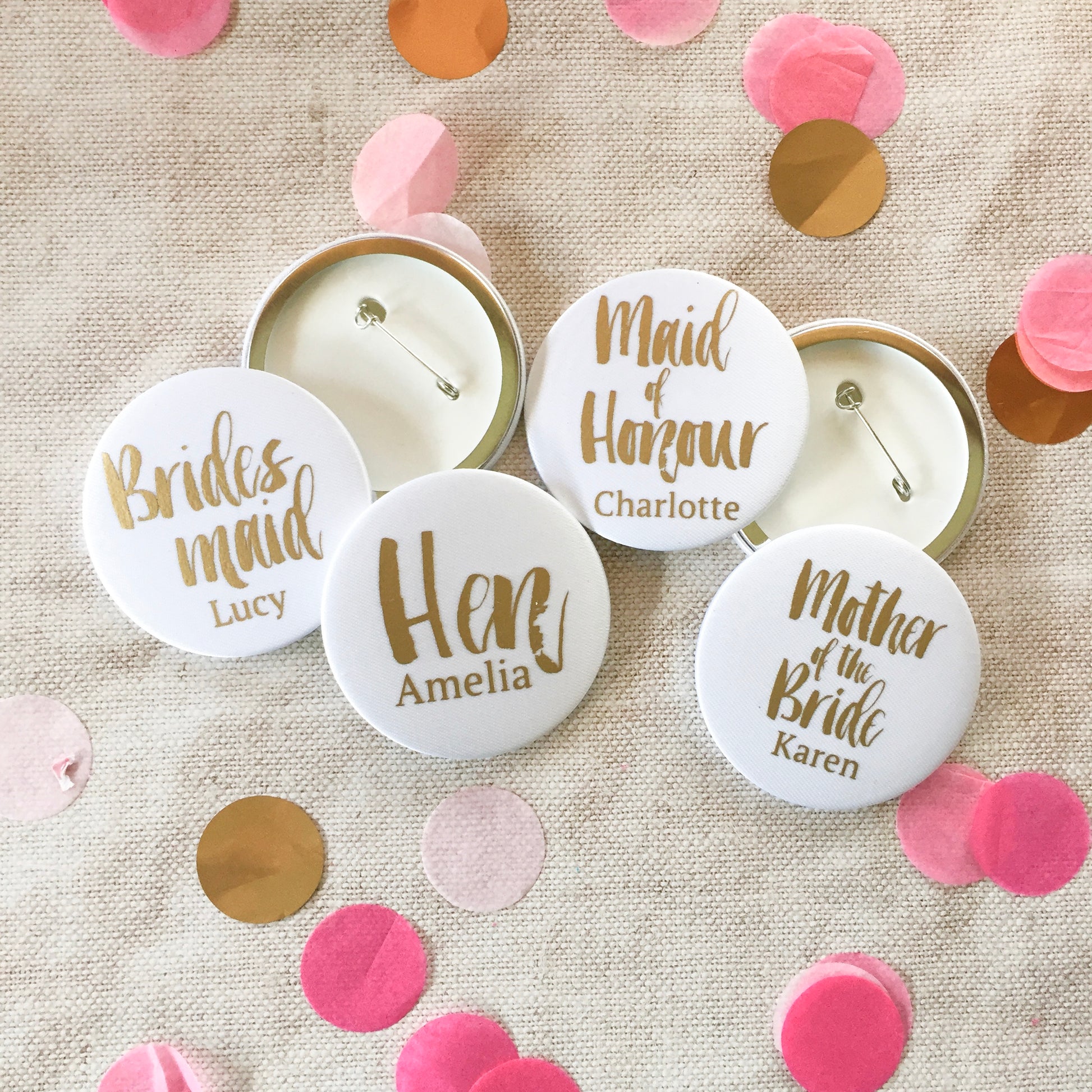 Choose from titles such as Bridesmaid, Maid of Honour, Mother of the Bride, Mother of the Groom, Sister of the Bride, Sister in law, Soon to be Sister in Law or simply Hen.