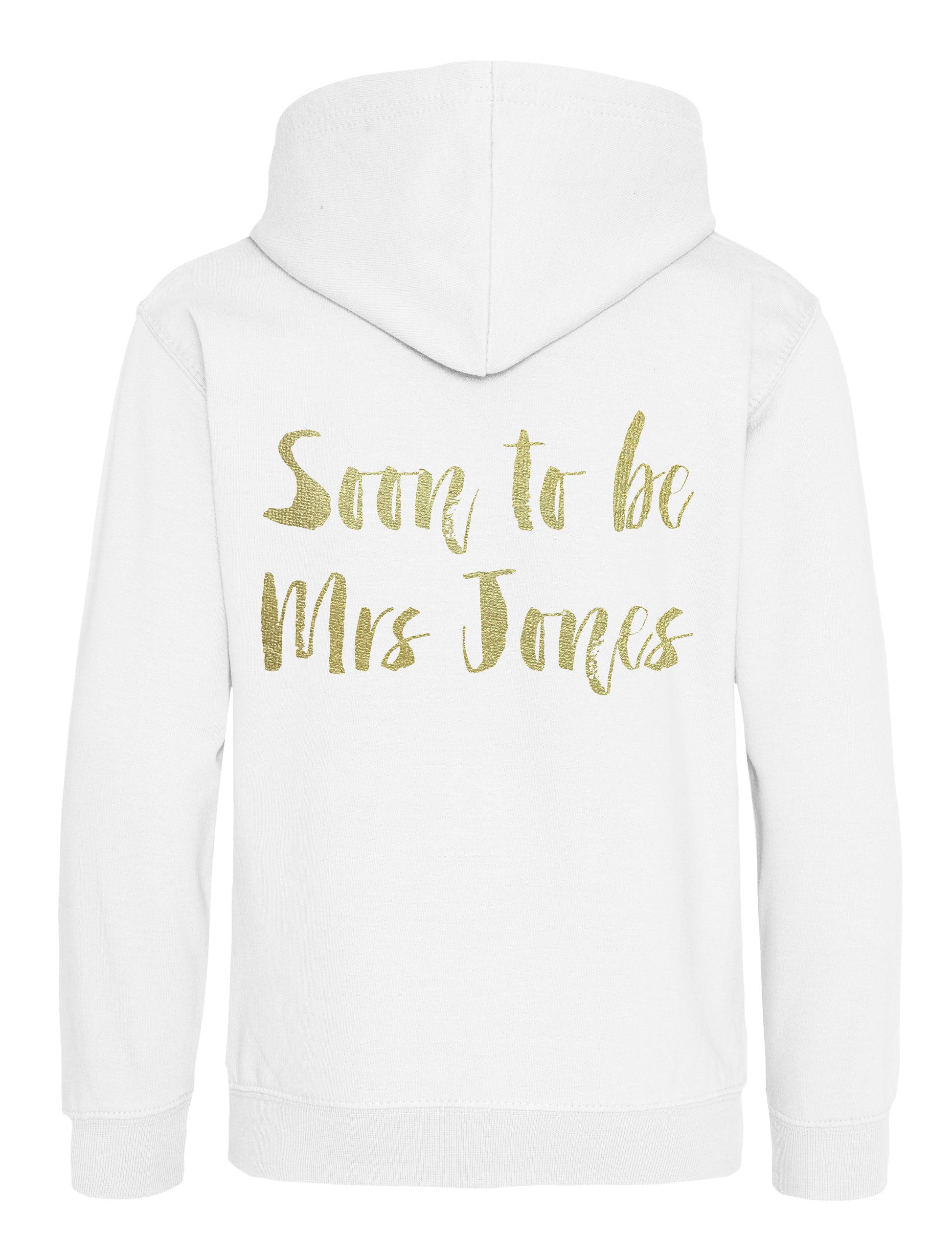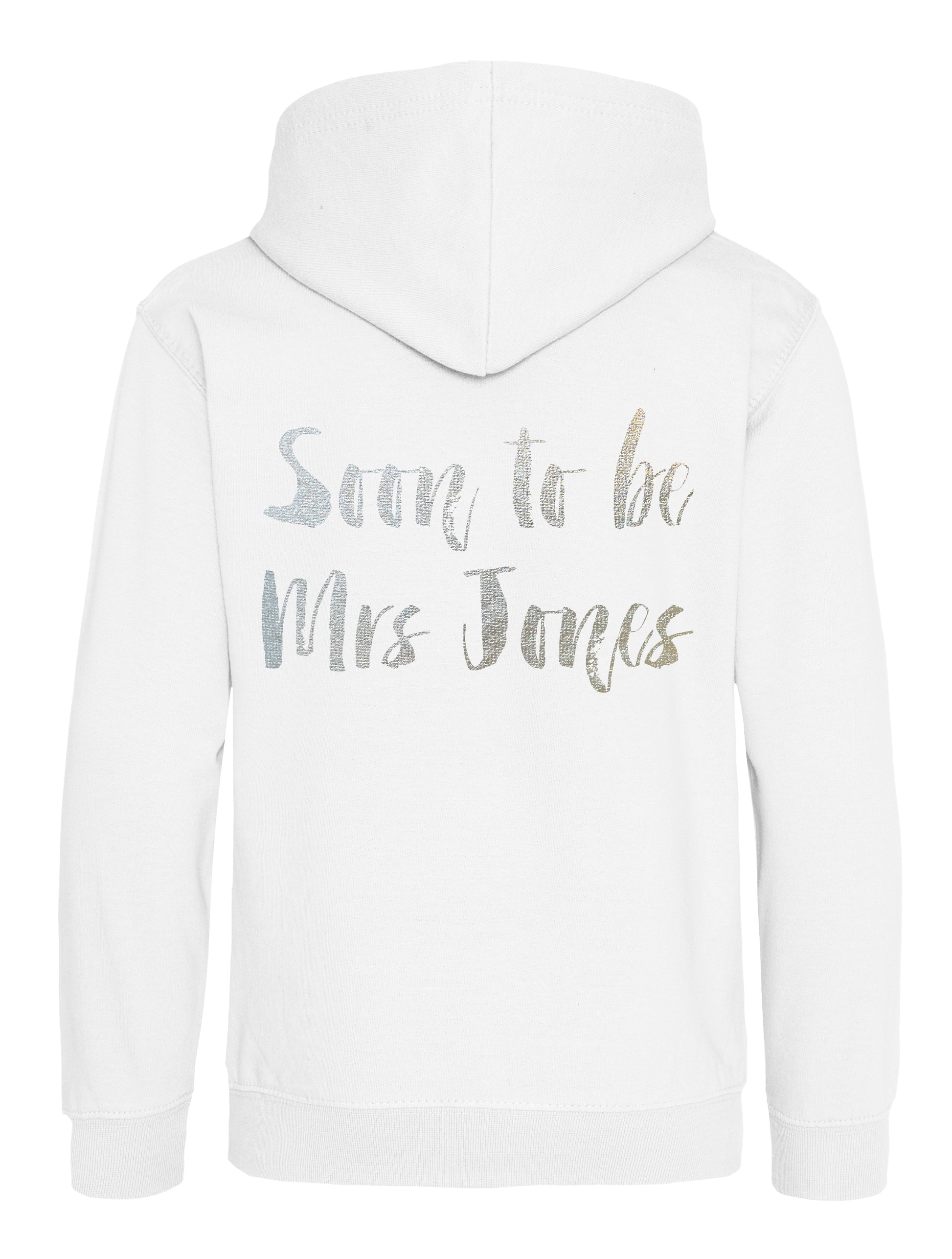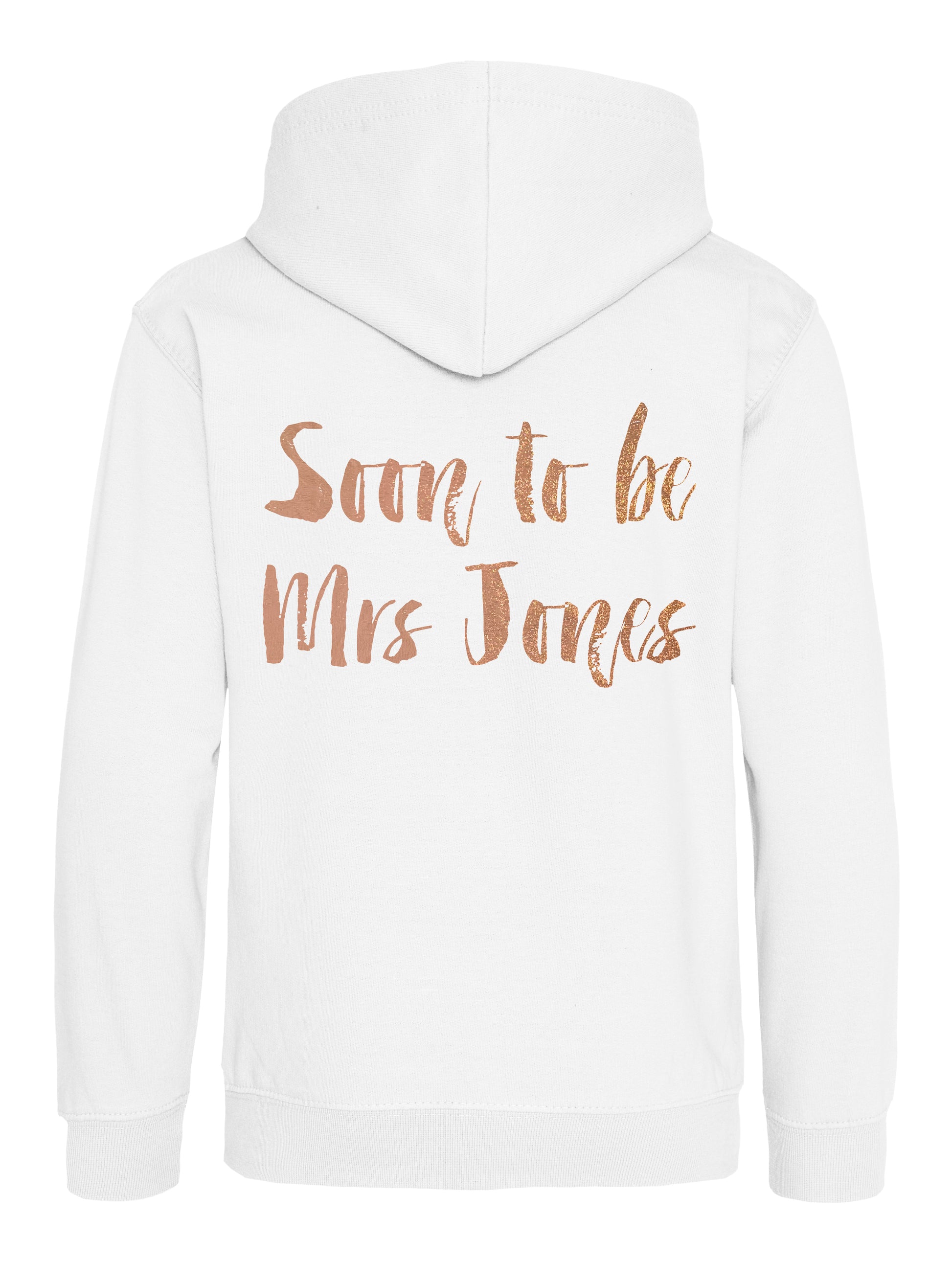 Beautiful soft white hoodies for the bride to be, perfect for Hen parties and celebrations in the run up to the big day. Choose from 3 beautiful metallic prints - Gold, Silver or Rose Gold.