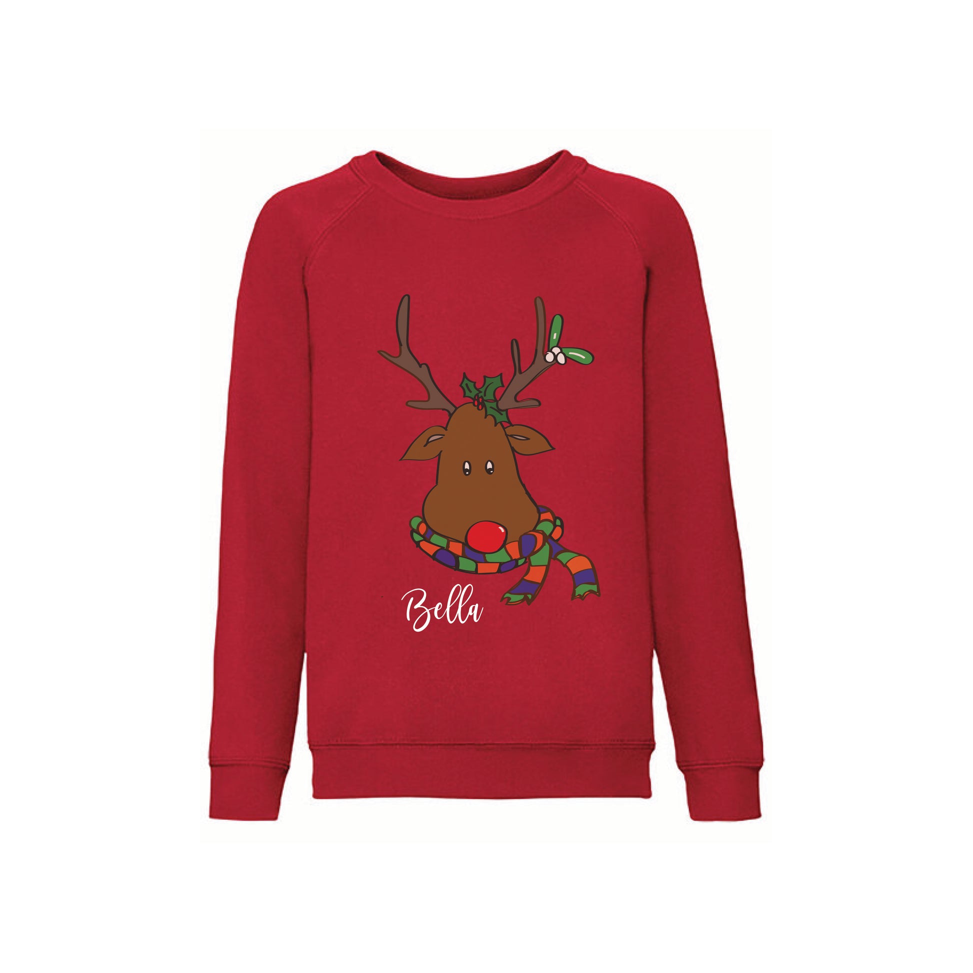 Personalised Christmas Jumpers to capture the Magic of Christmas. Our cute and cosy hand drawn reindeer design is personalised with the recipients name printed in white and is perfect for all the family.