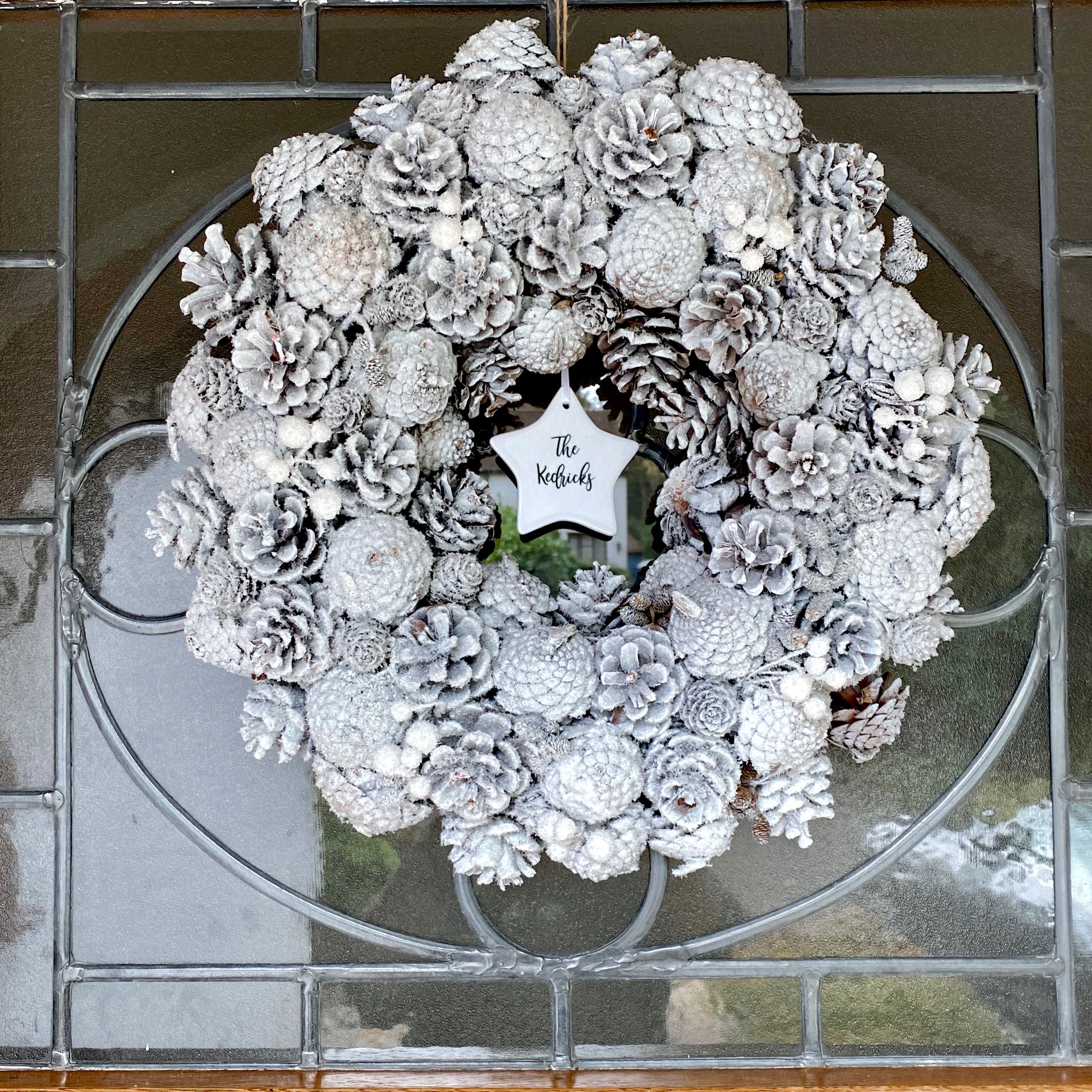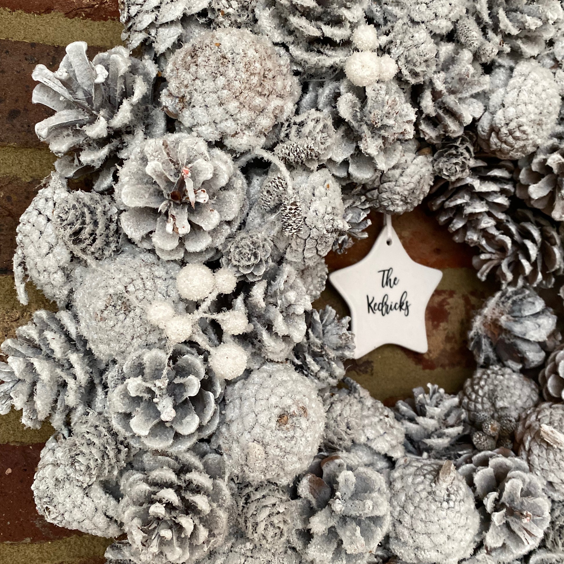 Equally suited to hanging on your front door or indoors using the attached jute string or a wreath door hanger. You can personalise the wreath with the gorgeous white ceramic plaque in the centre. Choosing either a star or a circle, you can add a message of your choice - the house name/number, family name or a message of Christmas wishes - which we will print in black.