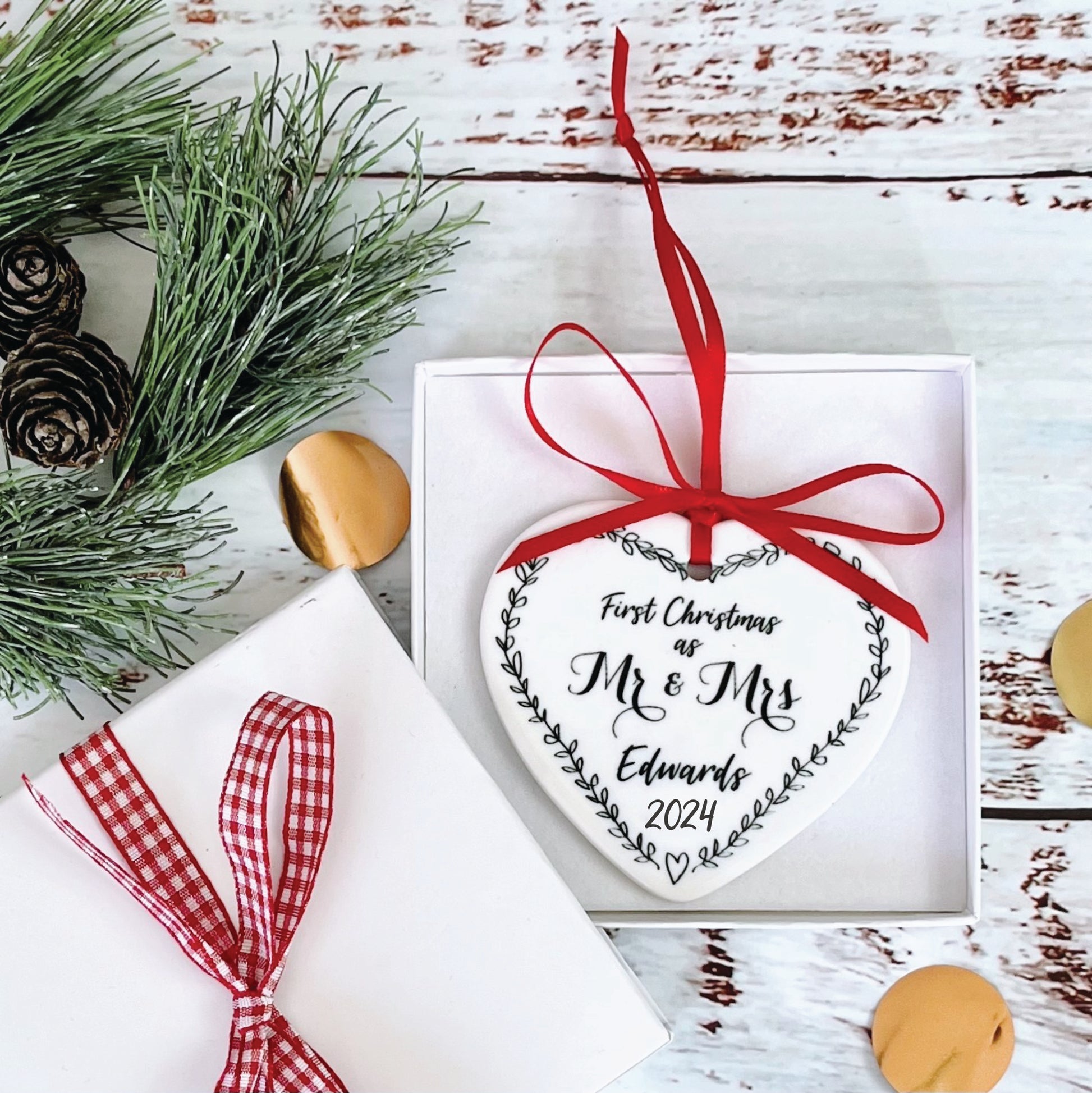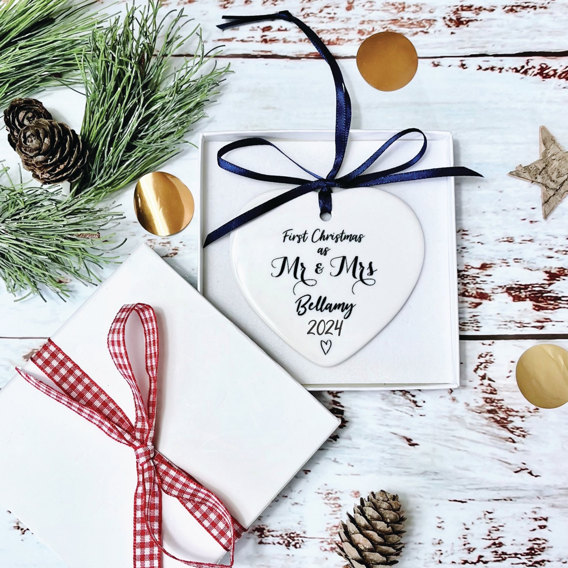 You will personalise the Heart decoration with the couples surname, which we will print in our elegant script font within the message 'First Christmas as Mr & Mrs [Surname] 2024. If you wish to have an alternative year, please just message us with the requirements.