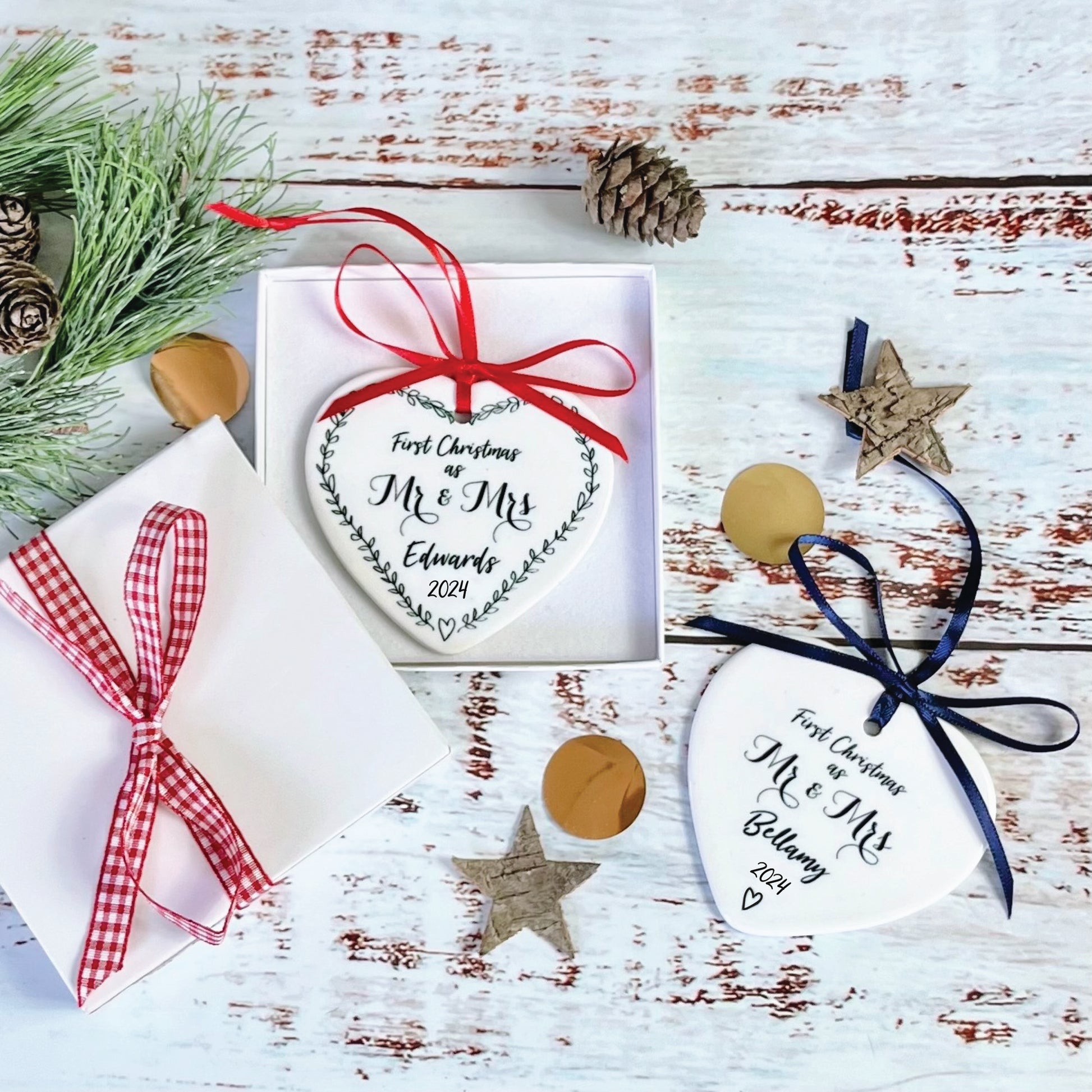These personalised Ceramic Heart decorations make a special gift for a couples 1st Christmas as Mr & Mrs.