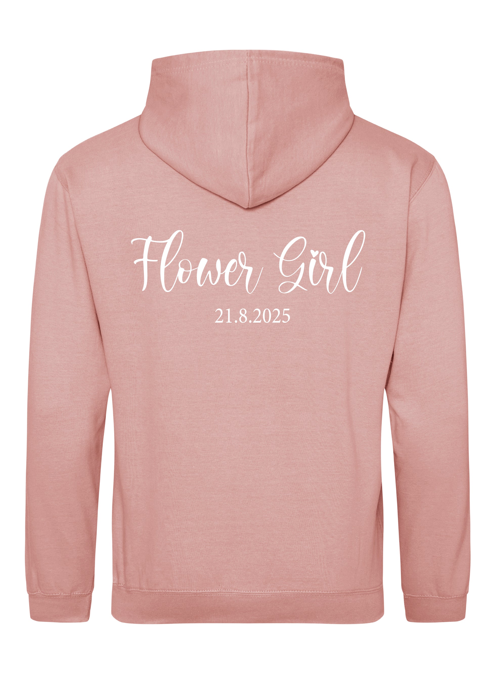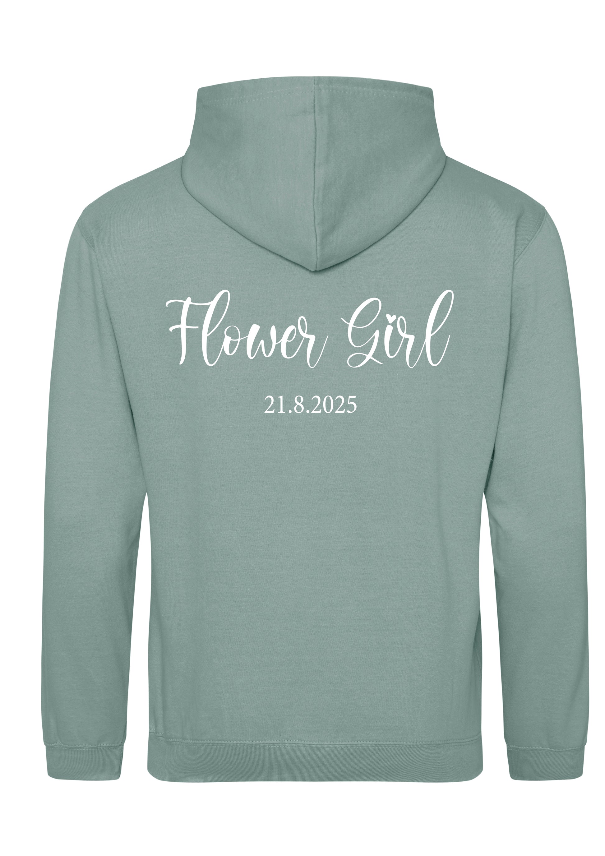 Beautiful soft hoodies for the flower girls. Choose from 3 gorgeous colours - white, dusty pink and sage green - and a variety of print colours.