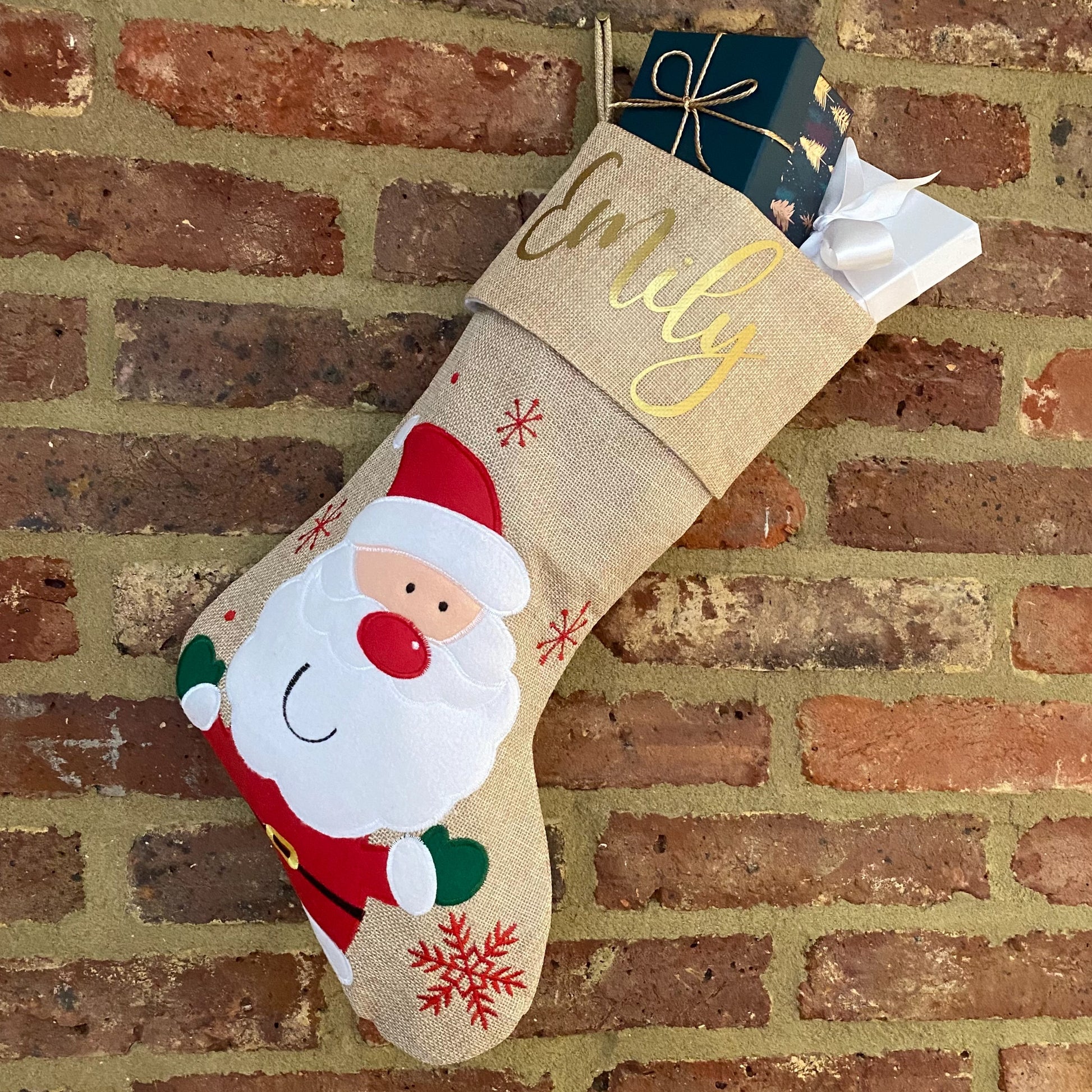 The stockings are made from natural hessian giving them a rustic traditional feel, and are fully lined in red. The Santa design is felt appliqué with embroidered snowflakes.