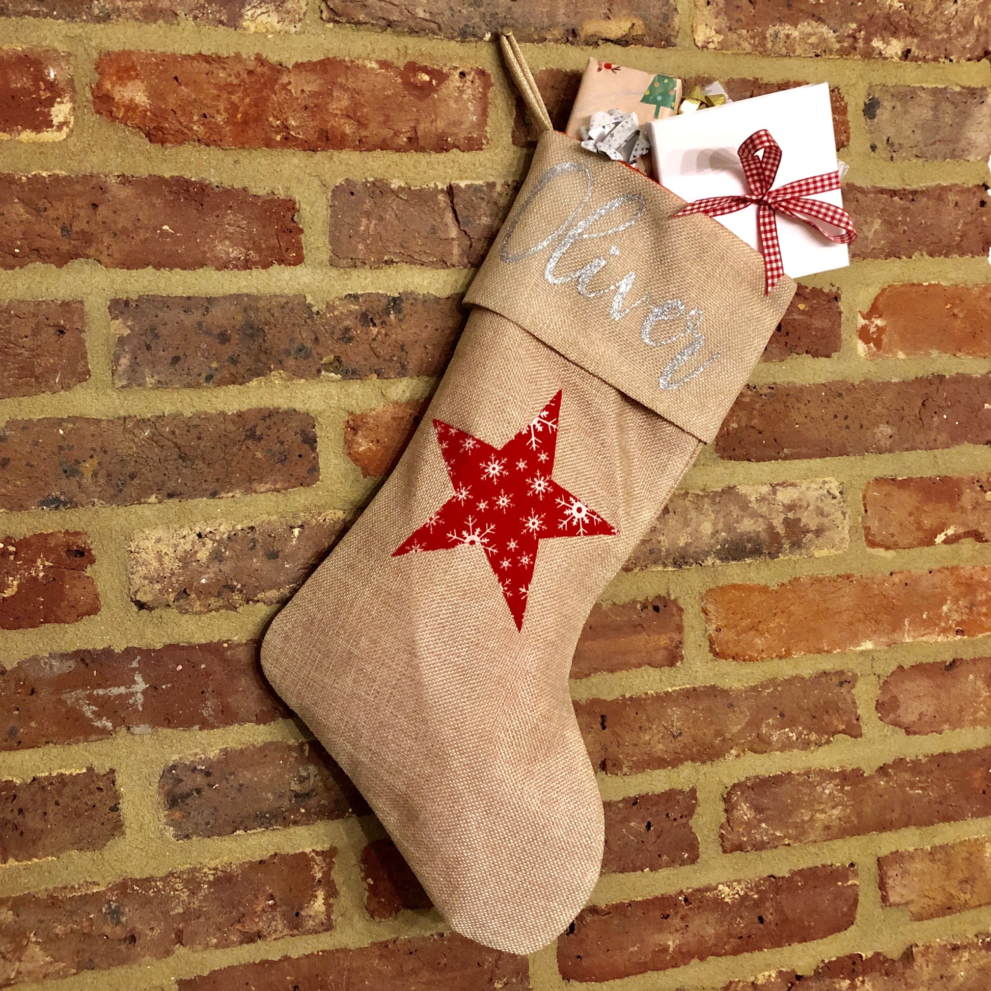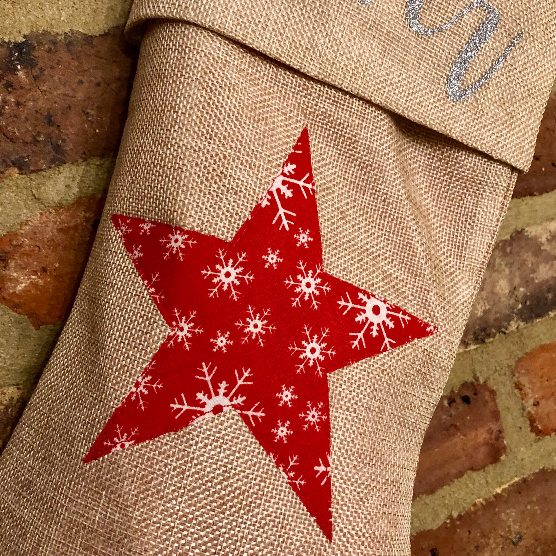 Made from hessian style fabric they have a traditional, rustic feel, and are fully lined in white fleece. The elegant and simple star design is made from red cotton fabric with a snowflake design and is stitched to the stocking by hand.
