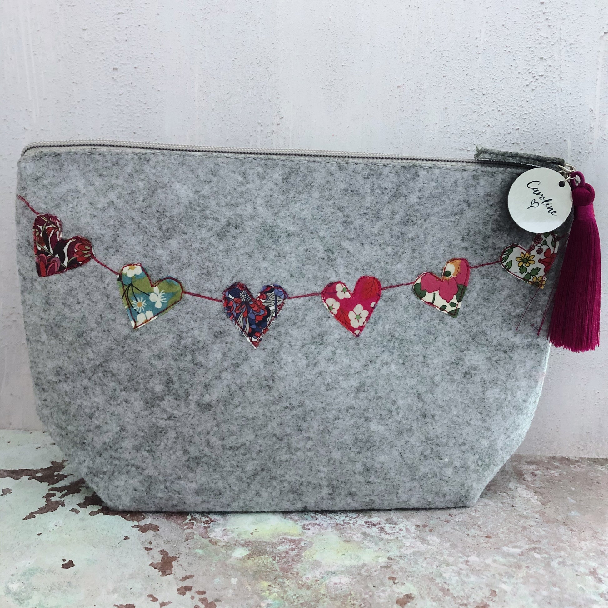 Made from Beautifully soft yet thick Pale Grey Felt with a matching grey zip closure, the bags are embellised on both sides with hand stitched Liberty Print Heart Bunting. The bunting design is made up of a mix of 6 iconic liberty prints cut in a delicate heart shape and stitched using bright pink cotton thread to create a lovely bunting effect. The bag is finished with a silky hot pink tassel on the zip.