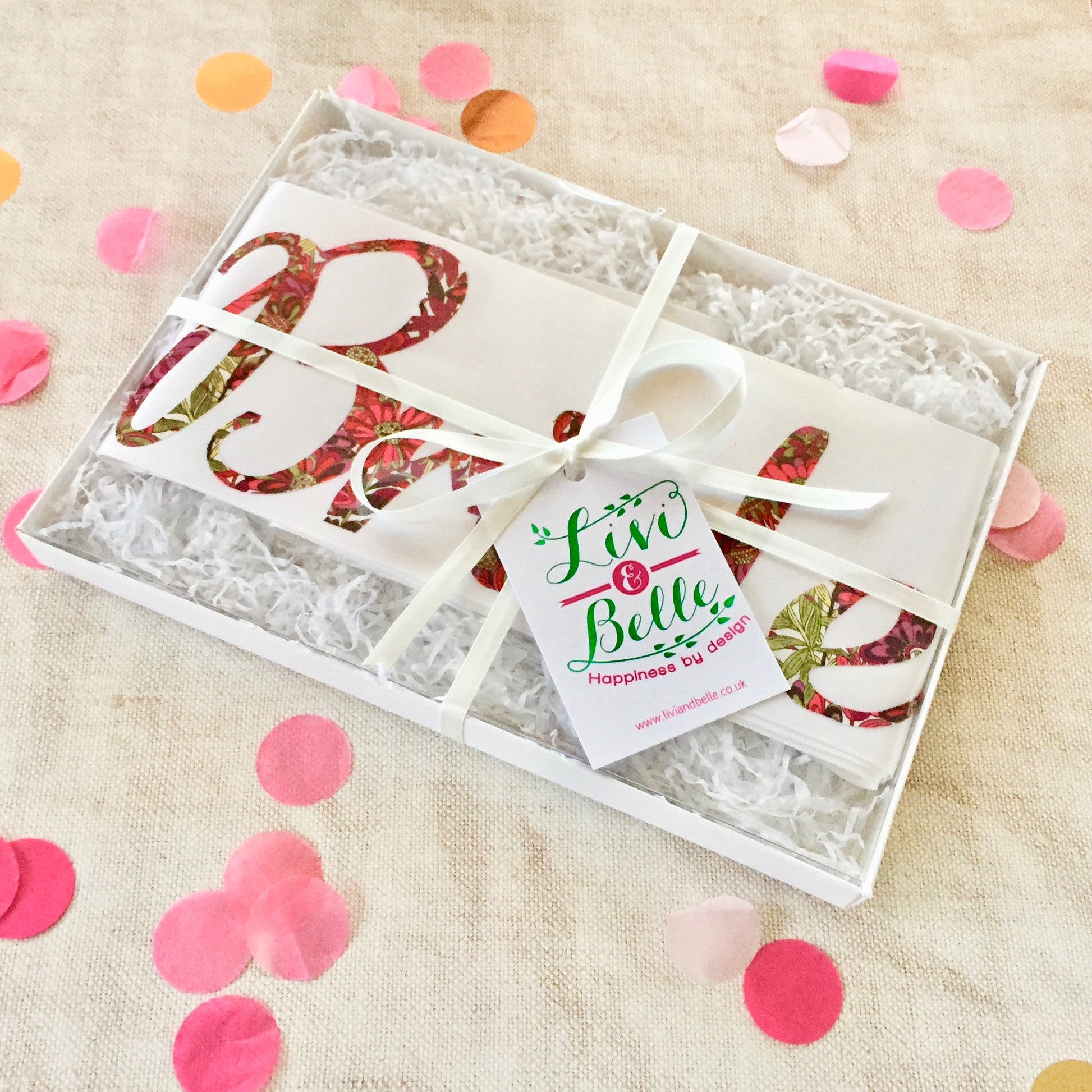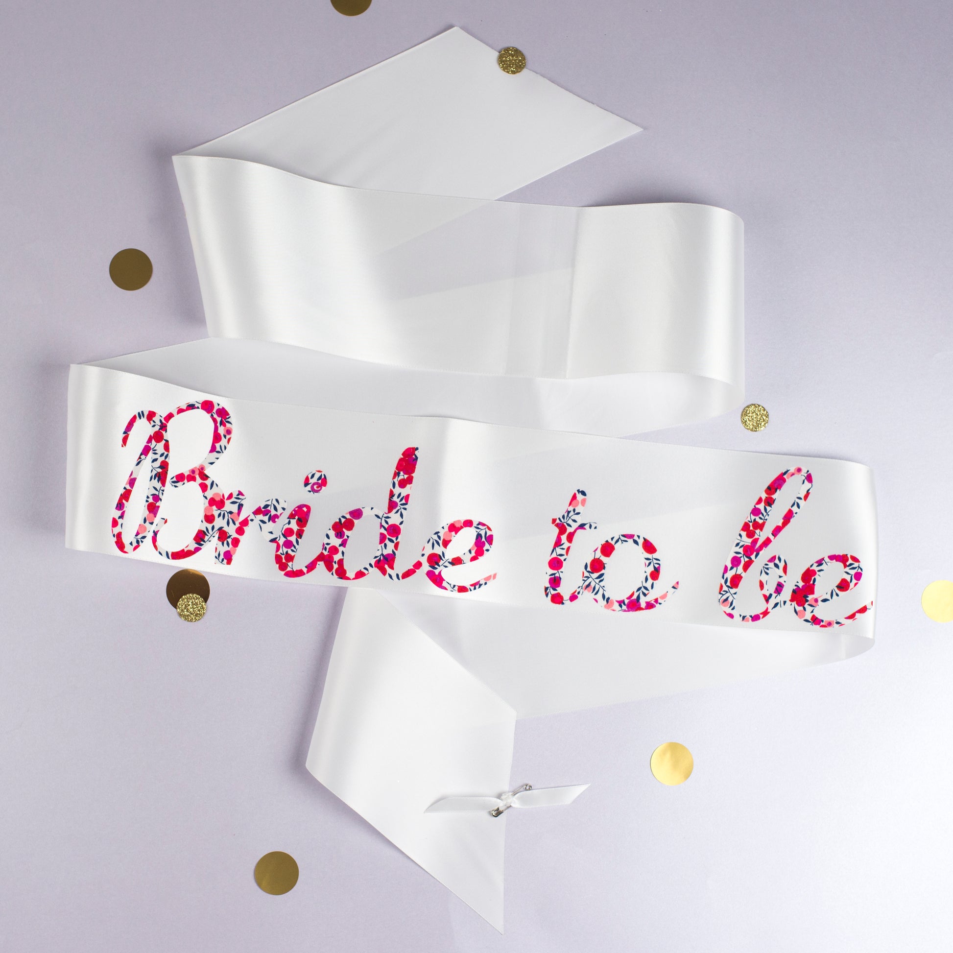 A beautifully luxurious hen party sash with fabric letters spelling out 'Bride to be' in an elegant script font, made from your choice of 32 Liberty Prints. Available Boxed or Unboxed.