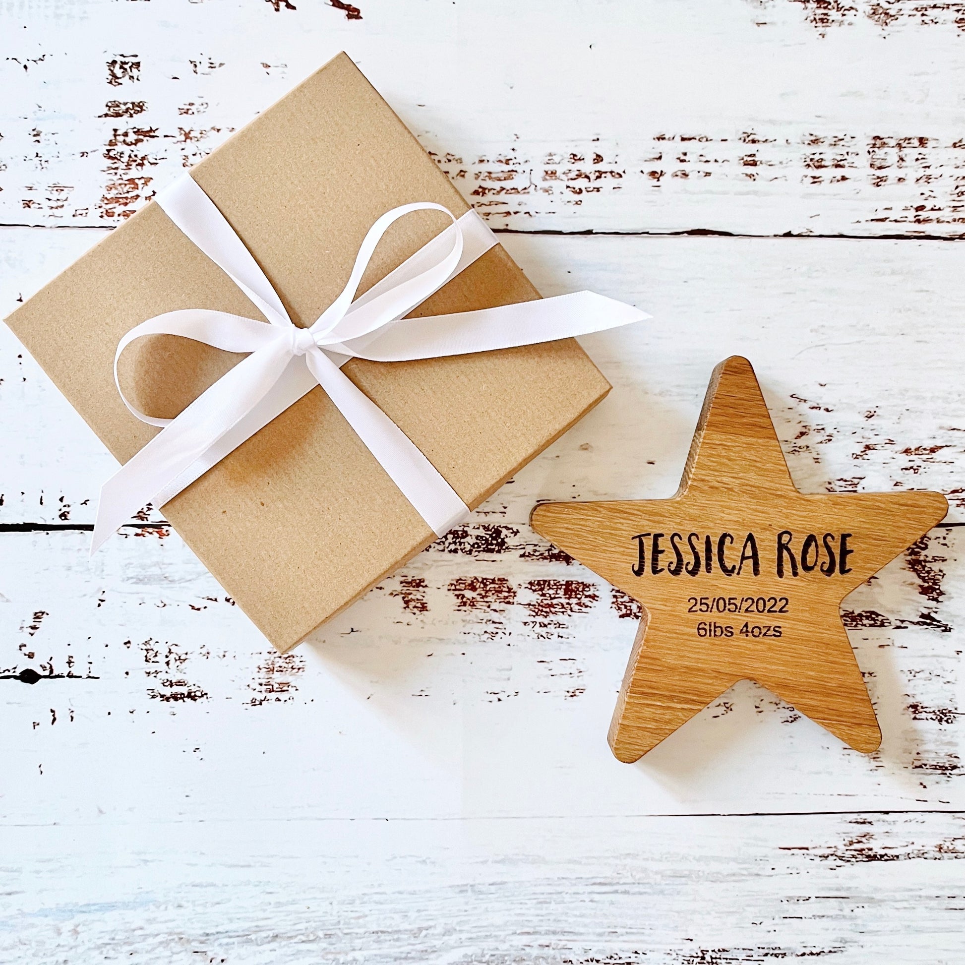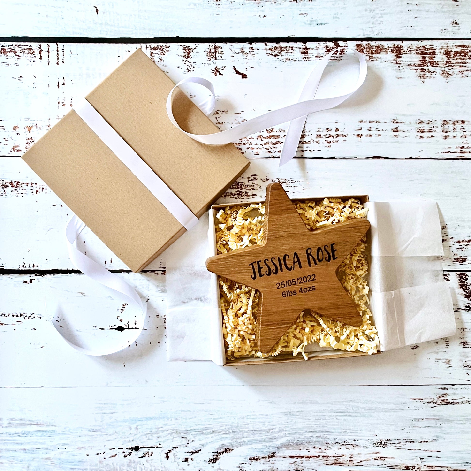 Each star is carefully wrapped in white tissue paper, or for an extra special touch why not add one of our lovely Kraft gift boxes finished with white satin ribbon and a gift tag.