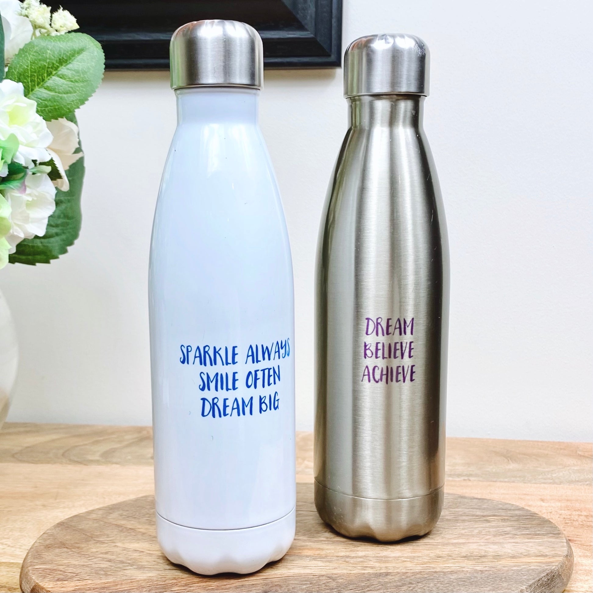 Refillable insulated water bottle personalised with a name and, if you wish, a message on the reverse which we will print in our Stylised Capitals font.