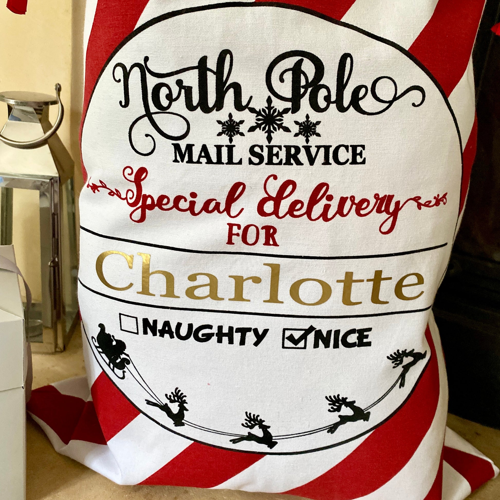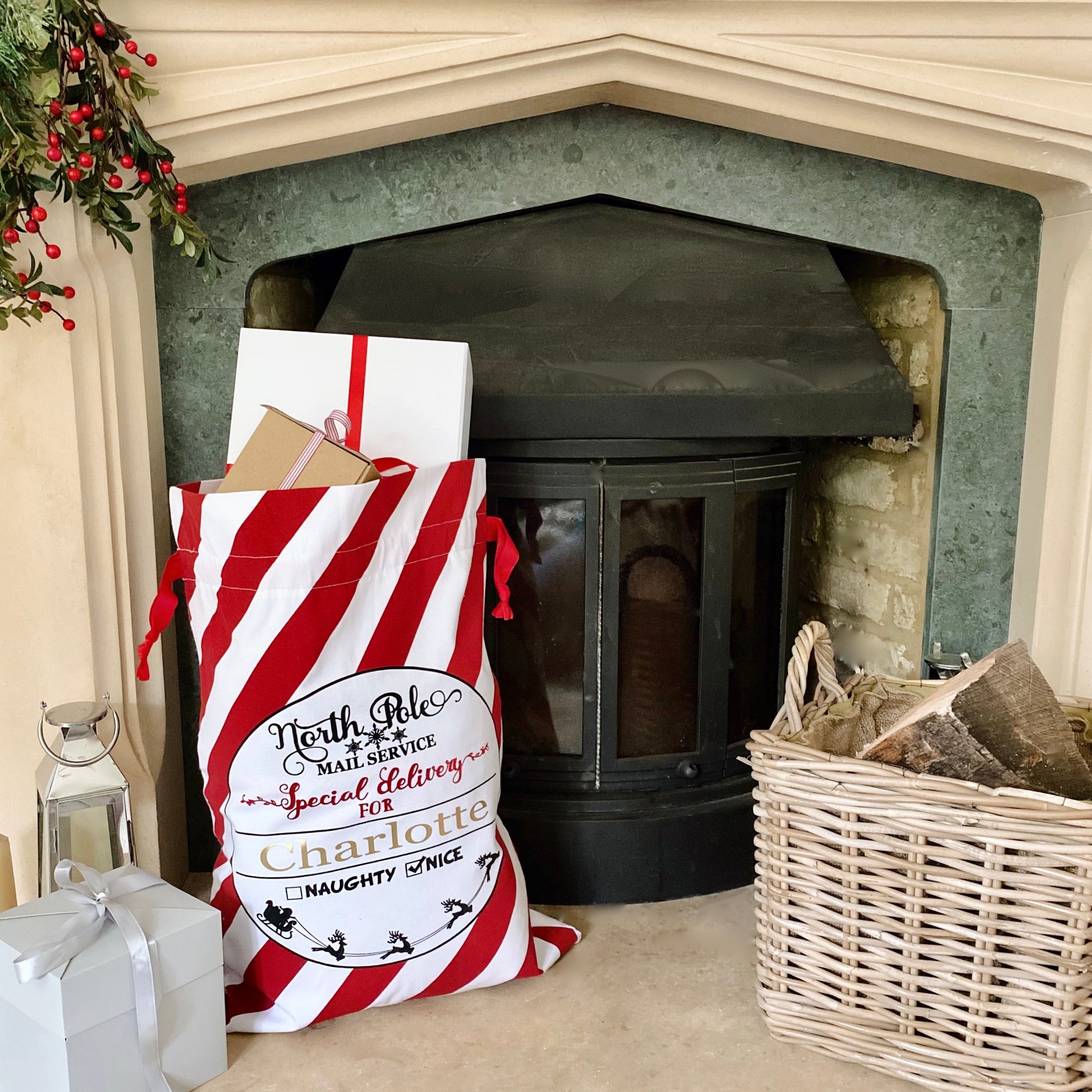 Made from thick 100% cotton, these sacks are printed with red and white candy stripes on both sides, and a logo design depicting the 'North Pole Mail Service' on the front. Personalised with the recipients name printed in Gold.