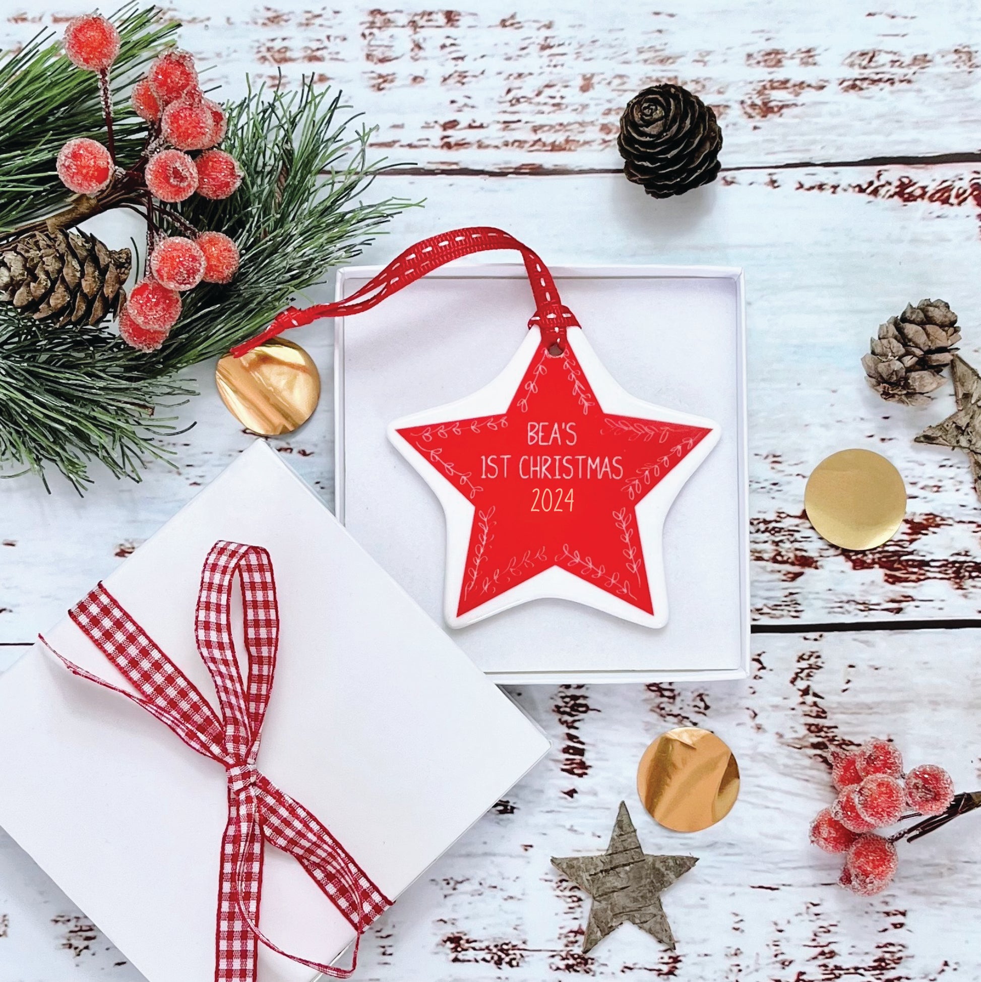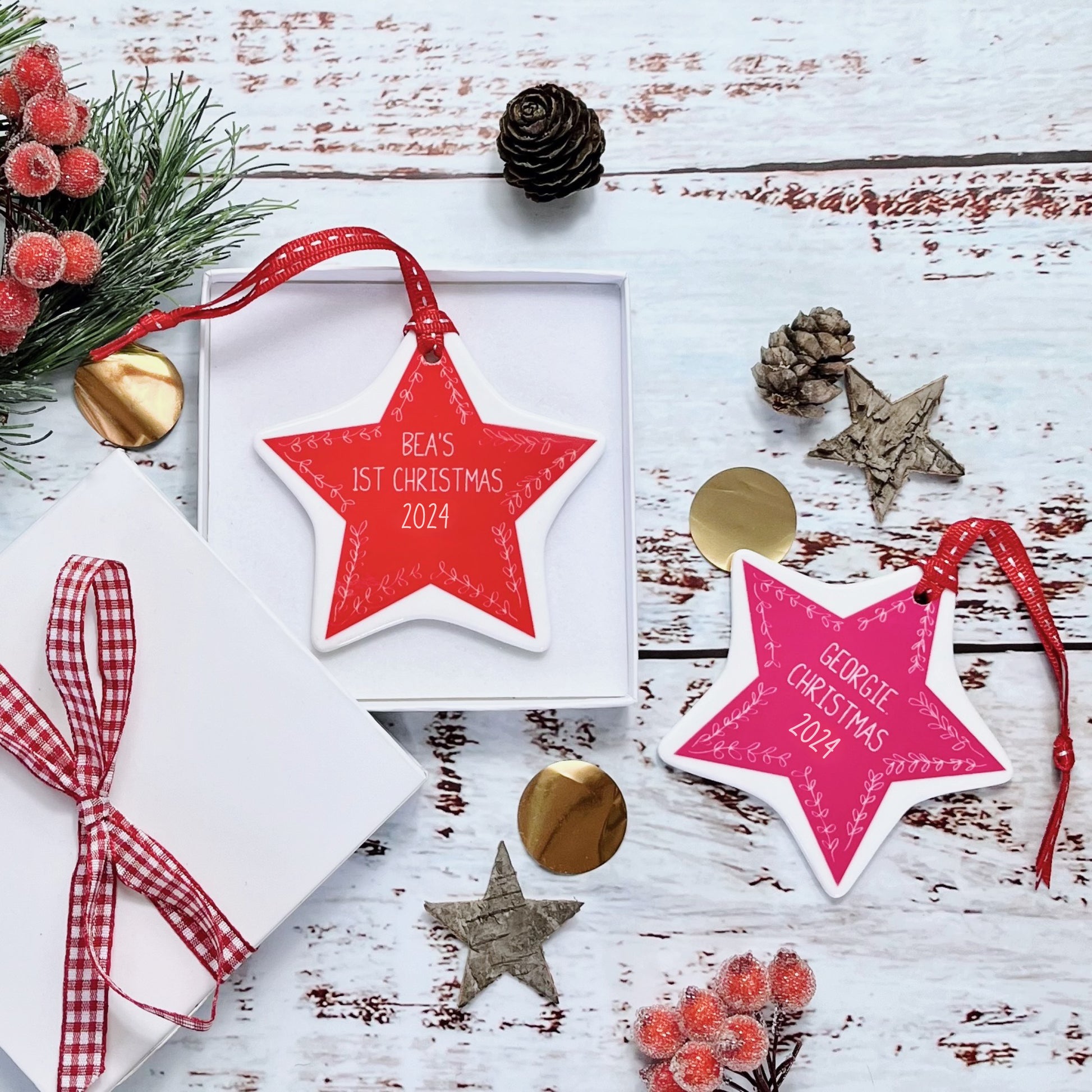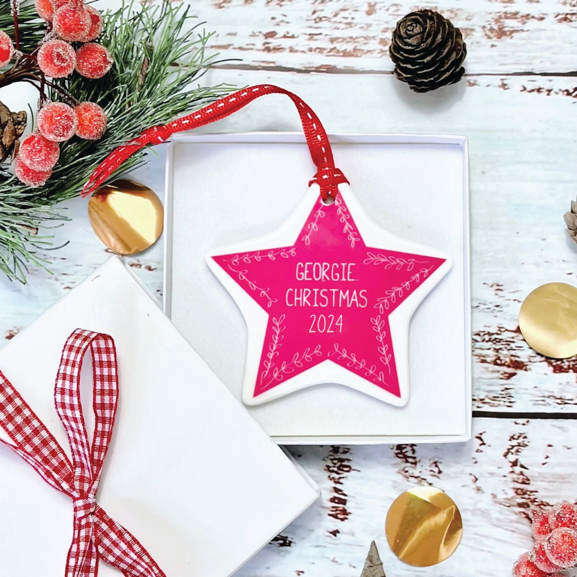 These personalised ceramic Star hanging decorations are a special gift at Christmas, perfect for children, teachers, grandparents and friends, a lovely keepsake all year round.