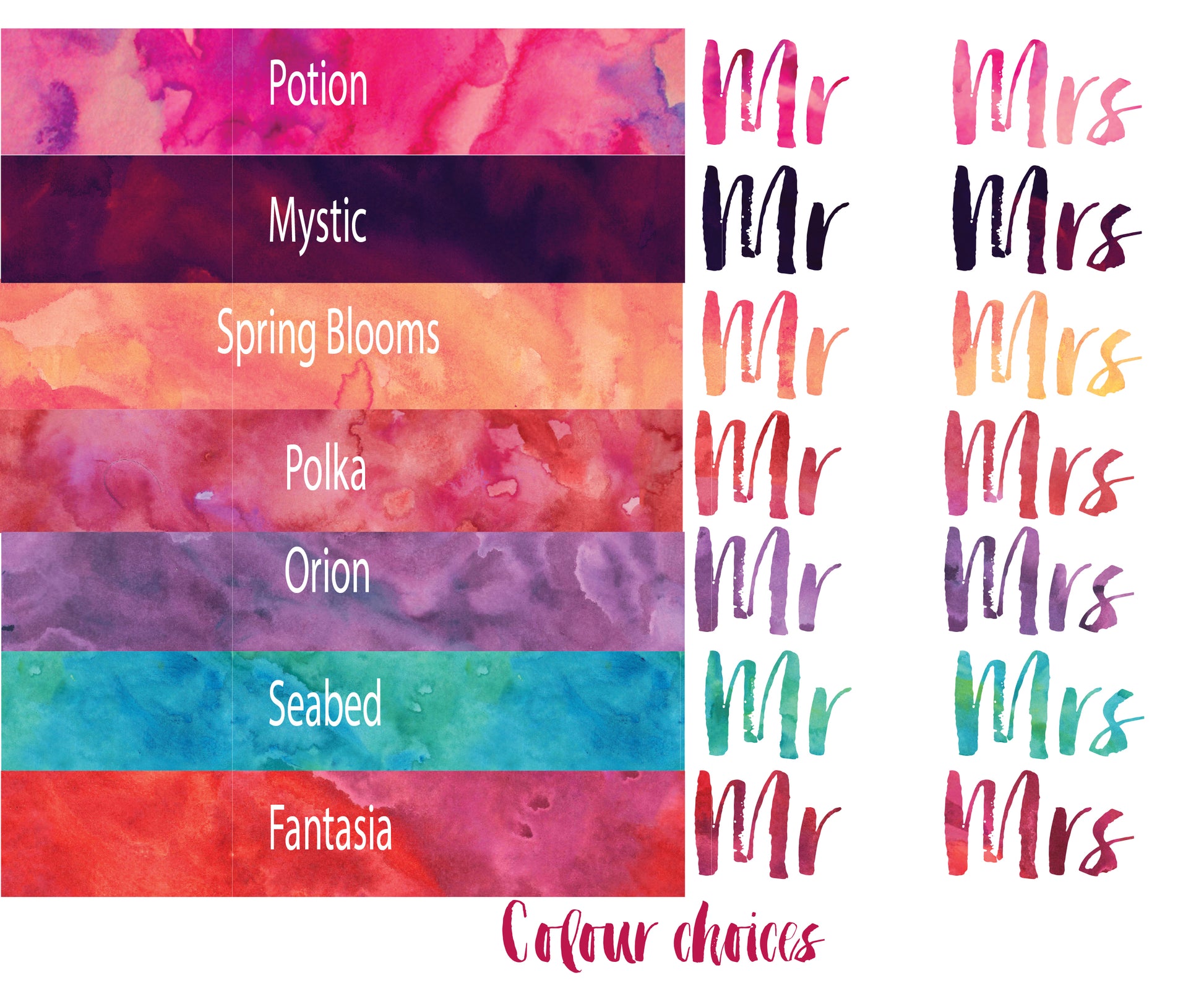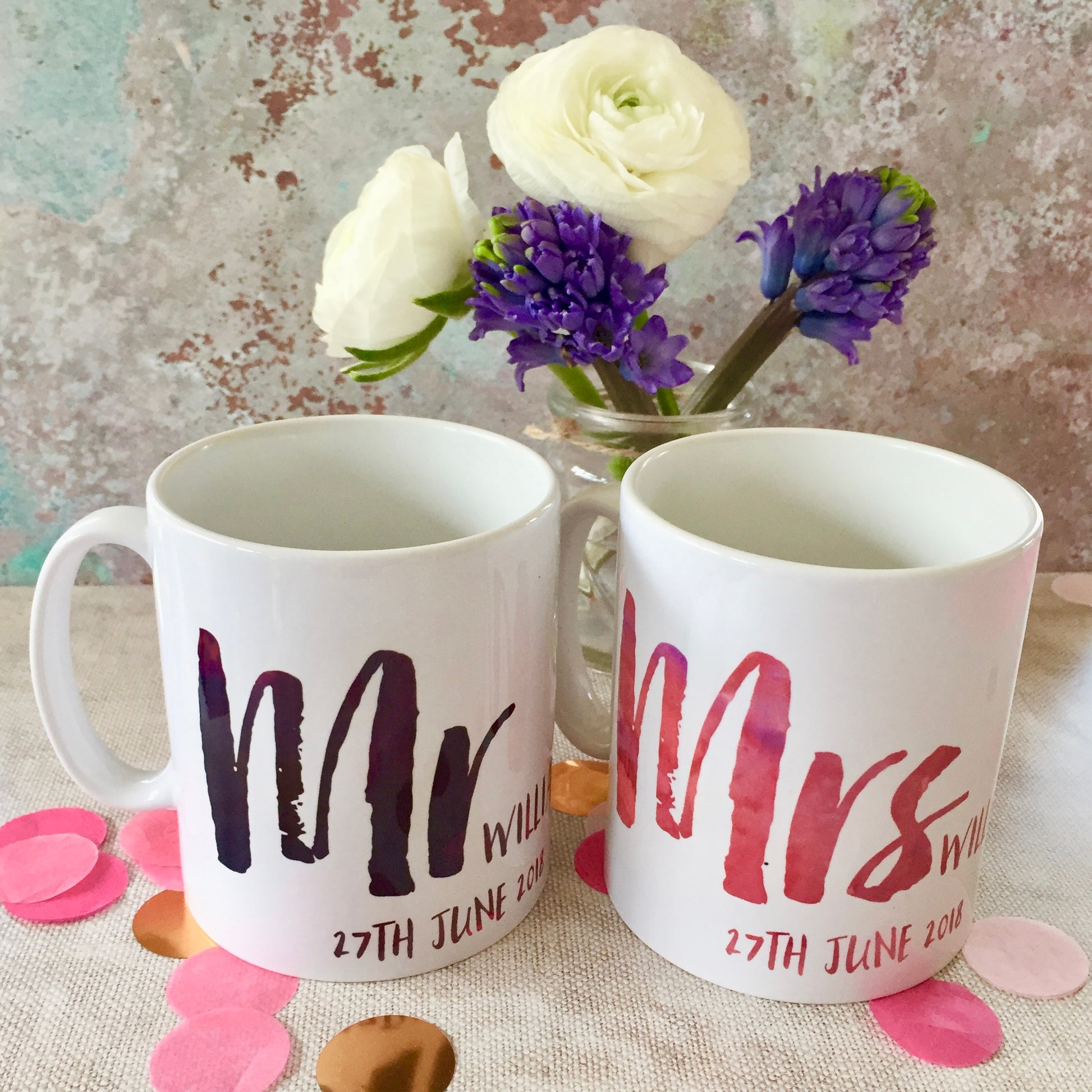 The Mrs design is in our modern contemporary brush font, and is available in a choice of specialist colour effects. Each colour option is a tonal combination producing a textured marbled effect, adding tone and texture to the design. You will personalise the mug with the couples surname and wedding date.