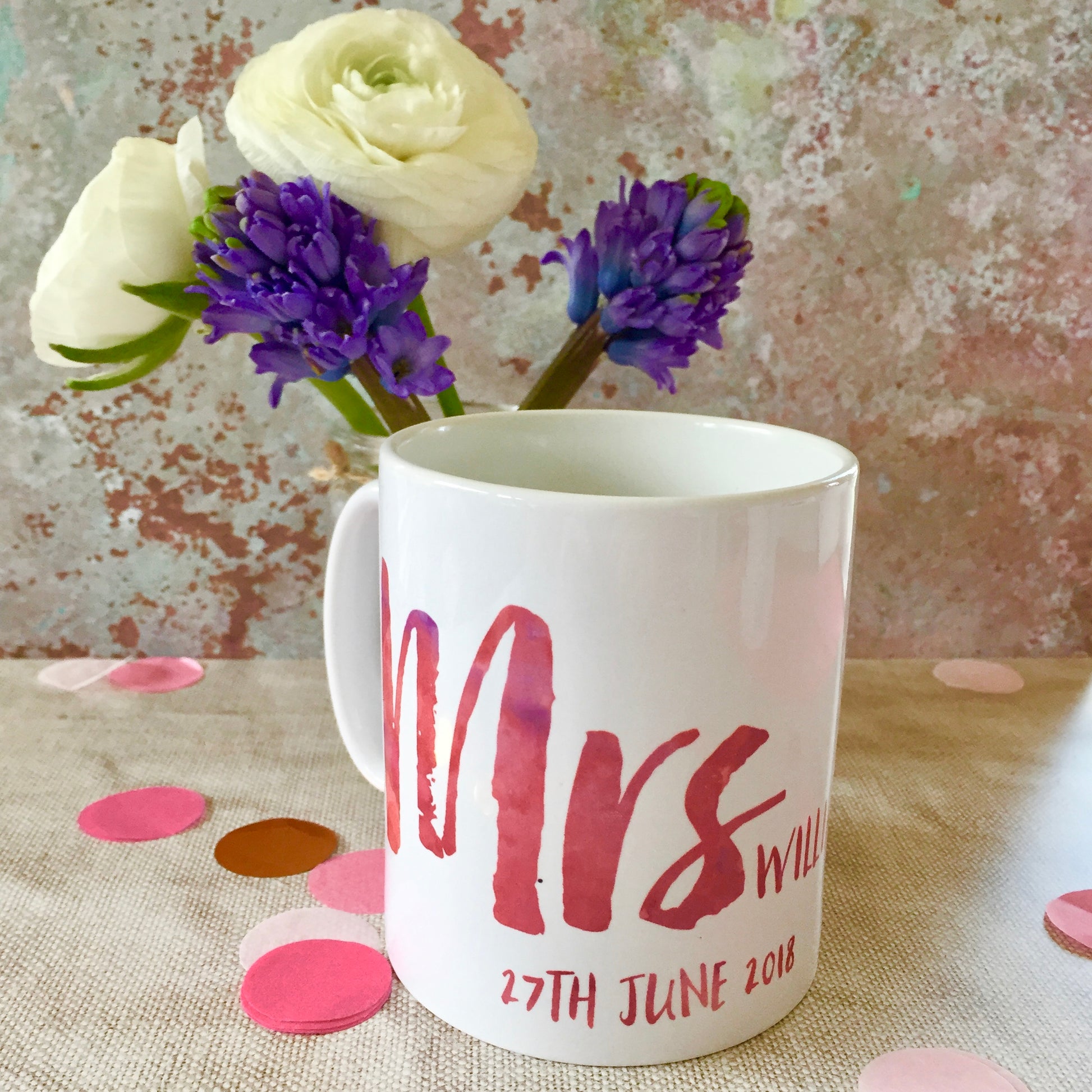A lovely contemporary Mrs Mug in our Brush font. This mug makes the perfect gift for a newly wed, a lovely keepsake as a wedding gift or as an anniversary gift.