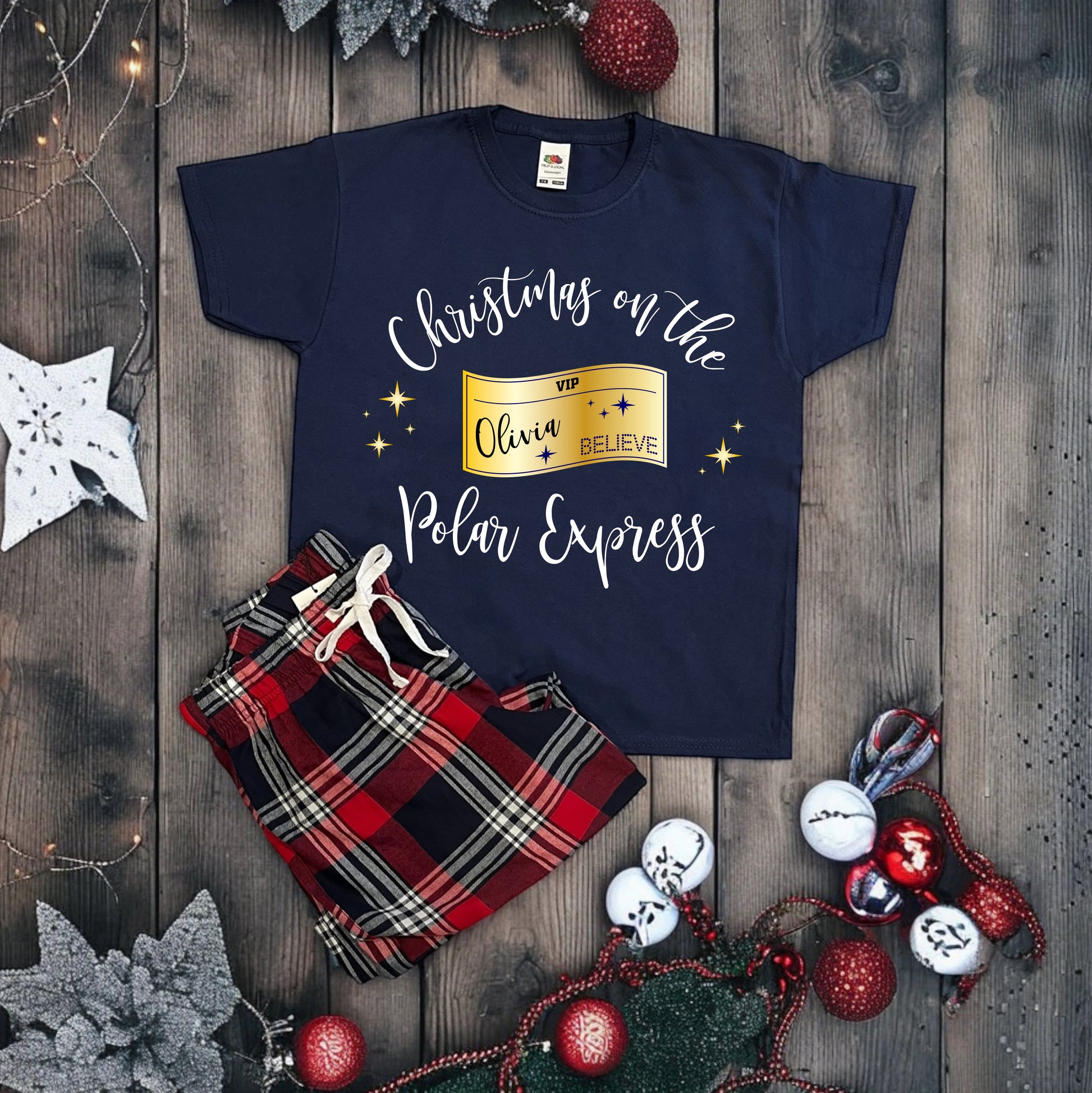 Matching Family Christmas Pyjamas to capture the Magic of Christmas. Our 'Polar Express golden ticket' design is personalised with the recipients name that will feature in the ticket design on the top, this is paired with comfy tartan lounge pants, perfect for all the family.