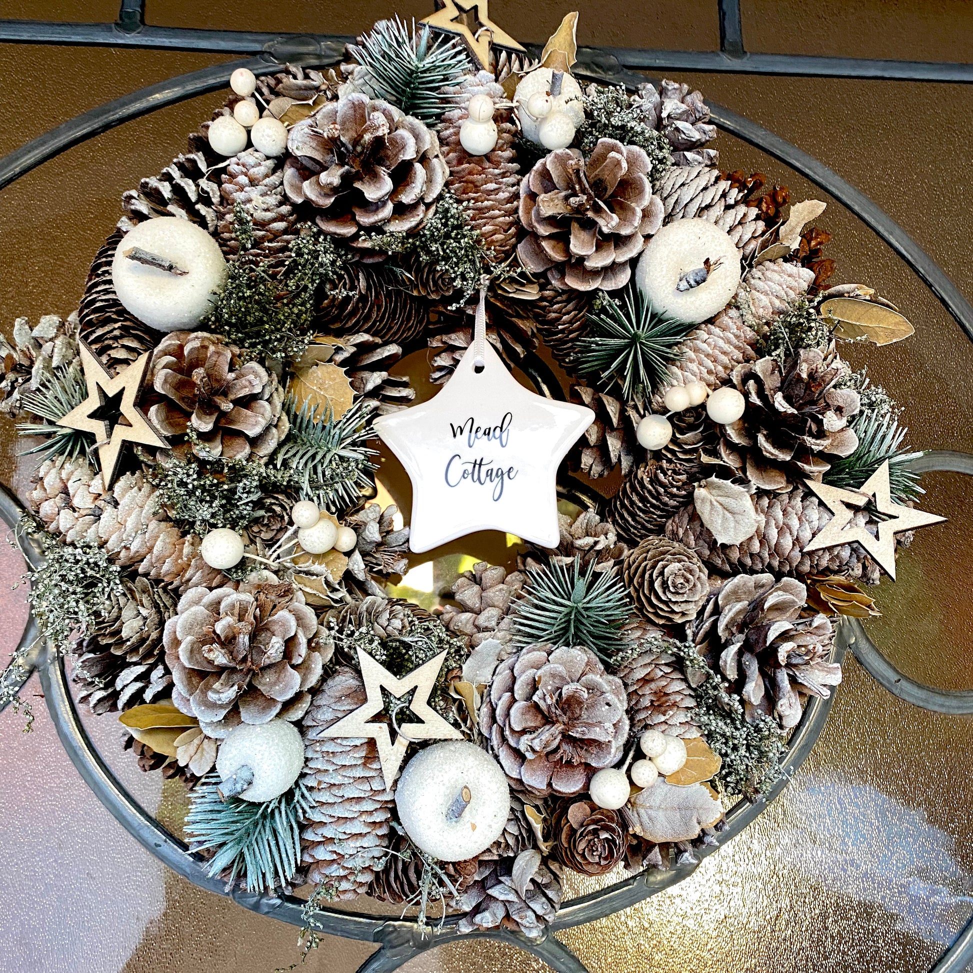 Natural Pine cones and dried foliage, artificial pine fronds, foliage, berries and apples, wooden stars, polystyrene wreath ring, jute string, ceramic plaque.
