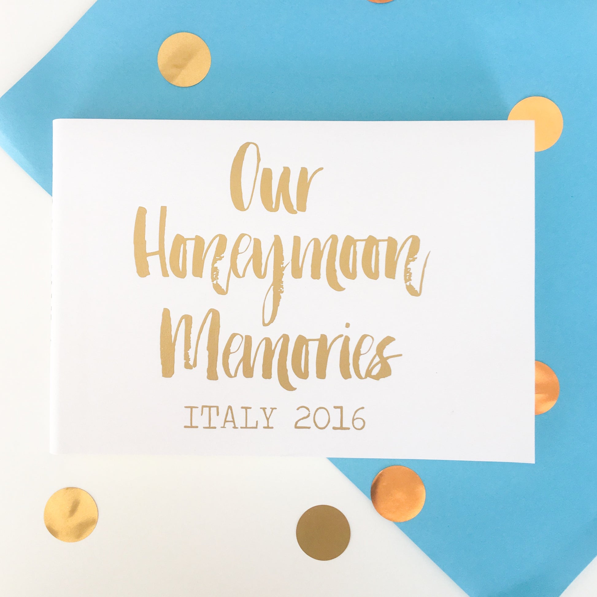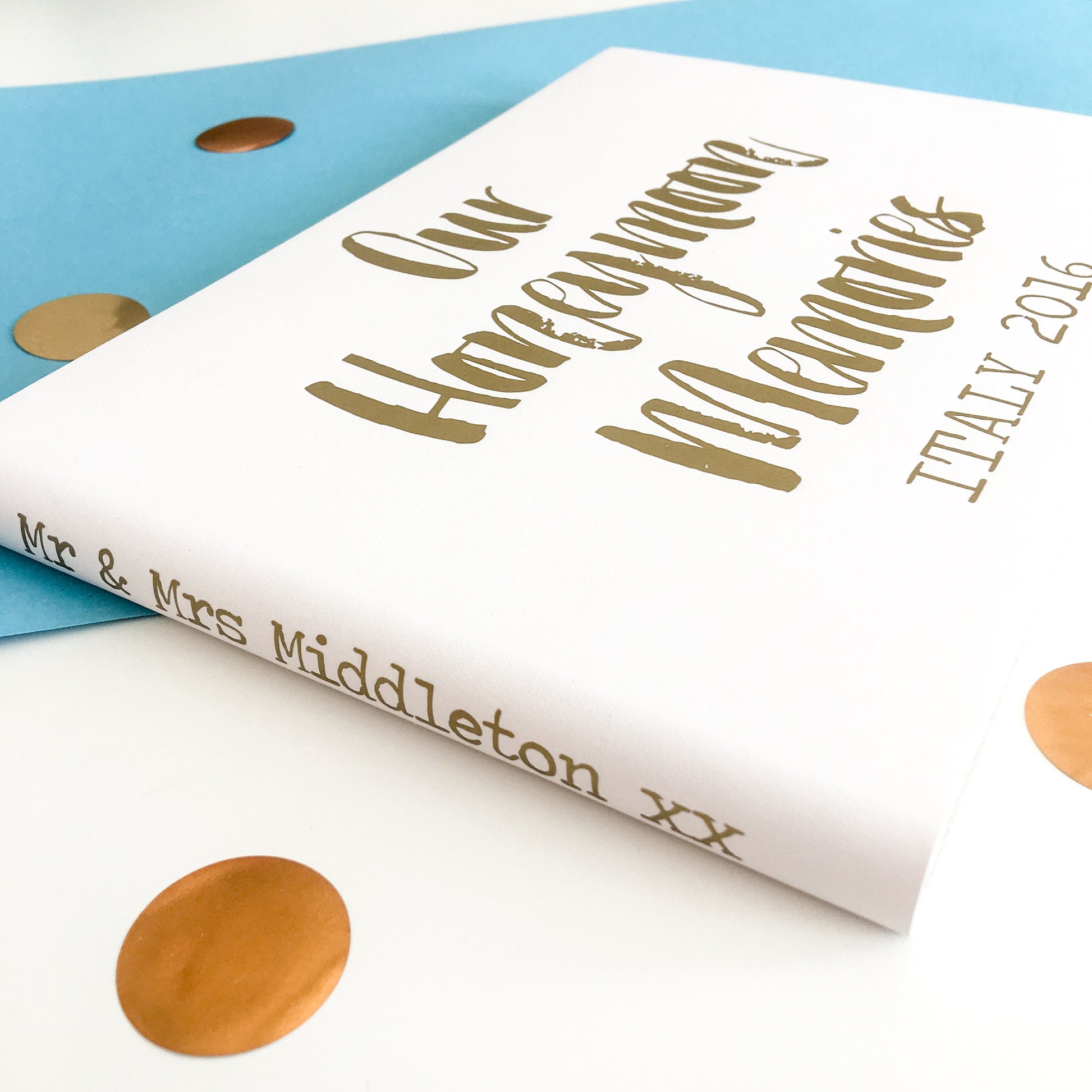 The contemporary brush style lettering on the front reads "Our Honeymoon Memories" and below this you will personalise the journal with the place and year on the front. On the spine you can personalise it with the couples names, such as Dr and Mrs Newton, Mr and Mrs Adams, Mr and Mr Reed, or Sophie and Greg etc, the choice is yours.