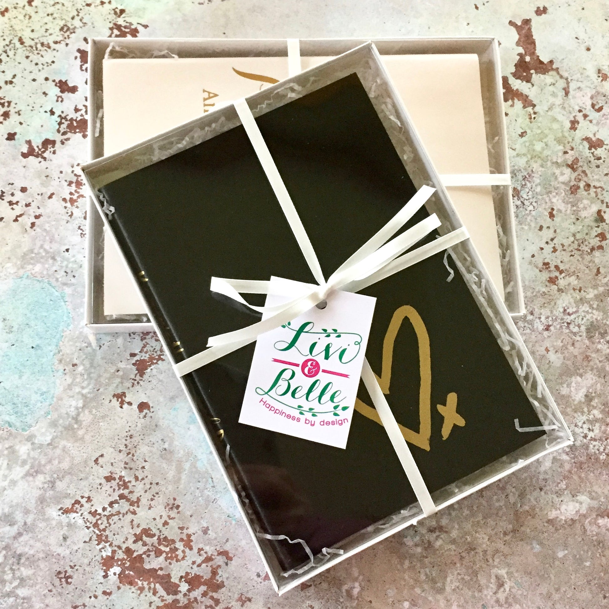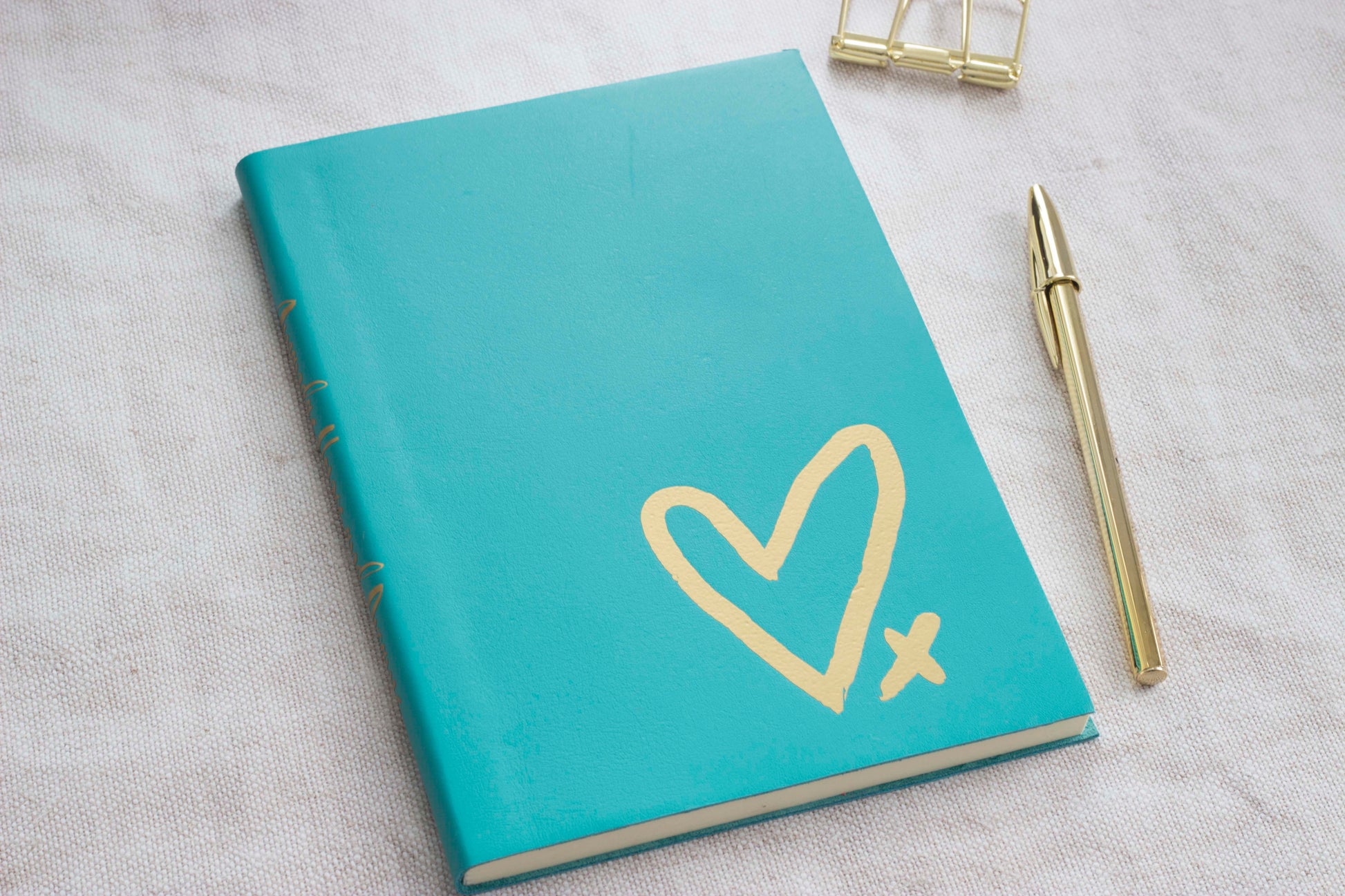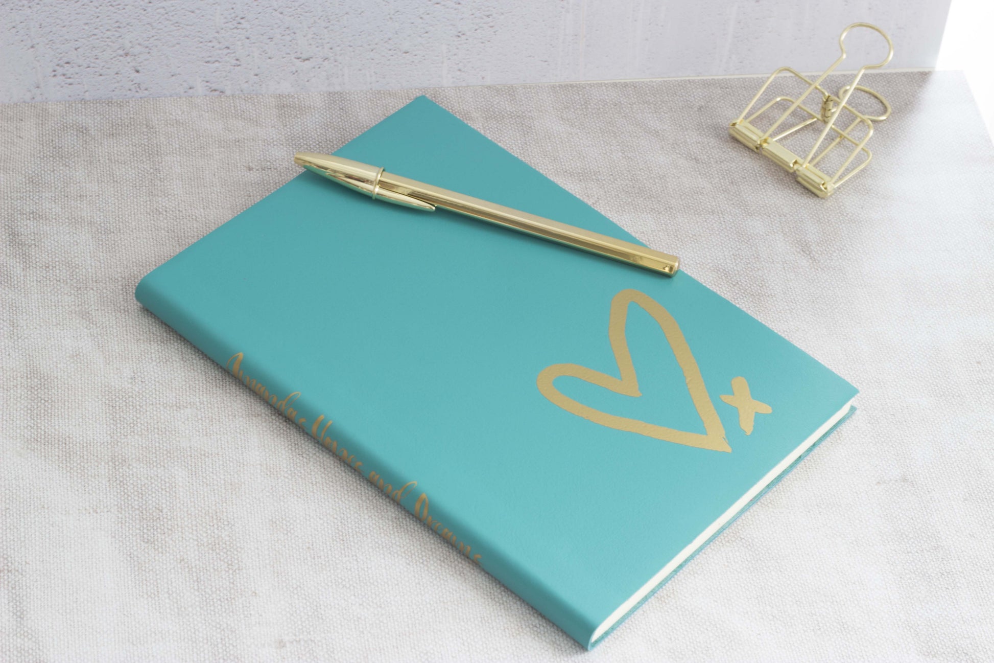 The front of the journal has a beautifully designed heart and kiss in a contemporary brush style font. You will personalise the spine of the journal with the recipients name, to read “(name's) Hopes and Dreams", a gentle reminder to note down future plans and ideas. Should you prefer a different message, please do just let us know.