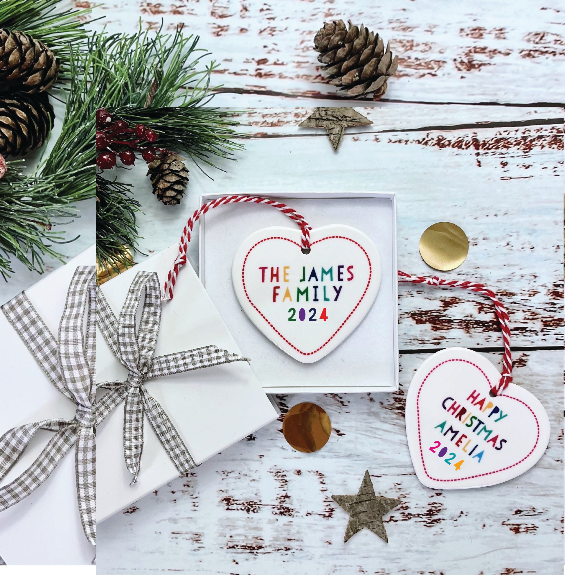 These Heart shaped Christmas tree decorations include your choice of message, with four lines available to commemorate a special Christmas, or wish someone special a very Happy Christmas 2022.