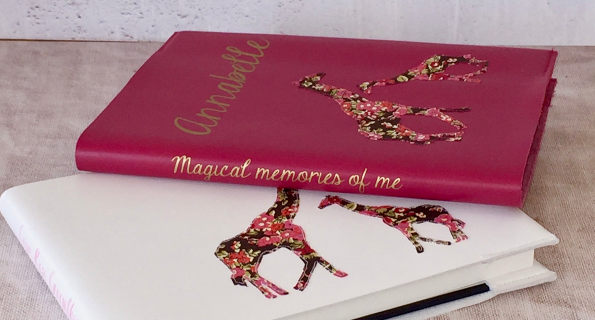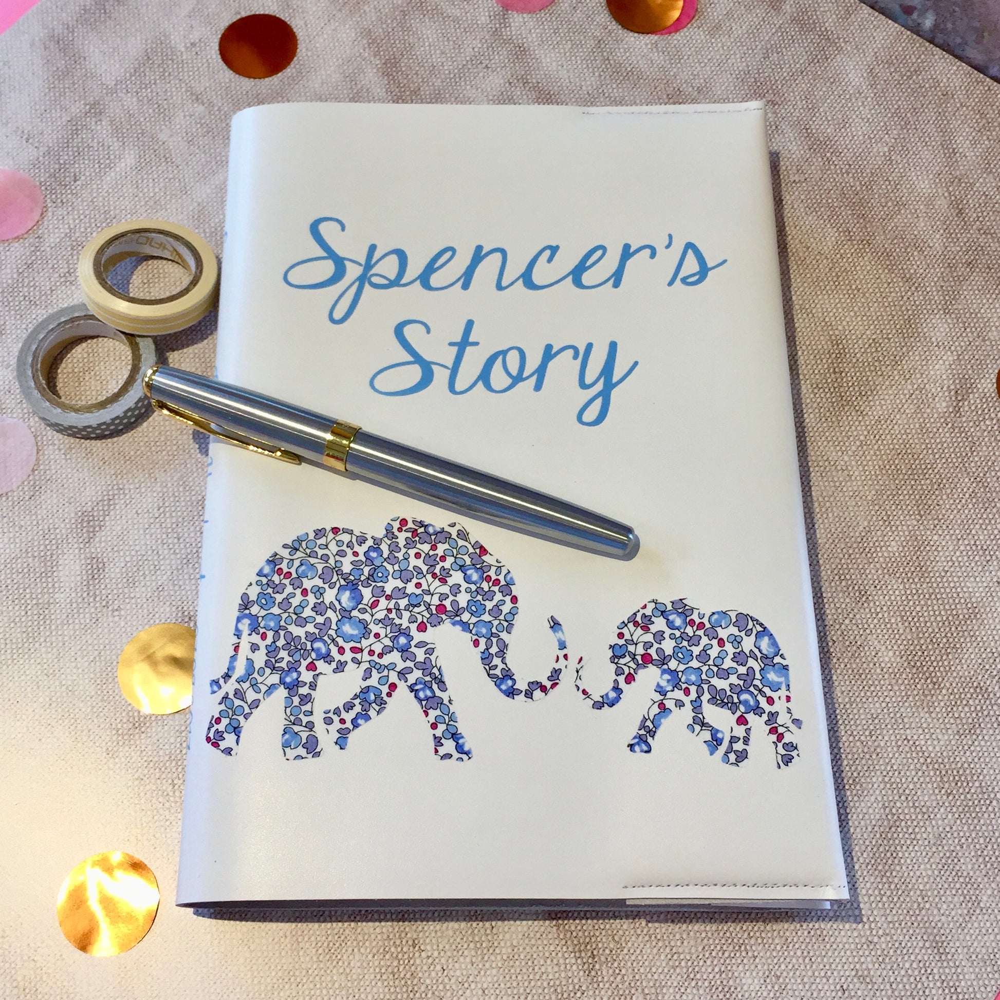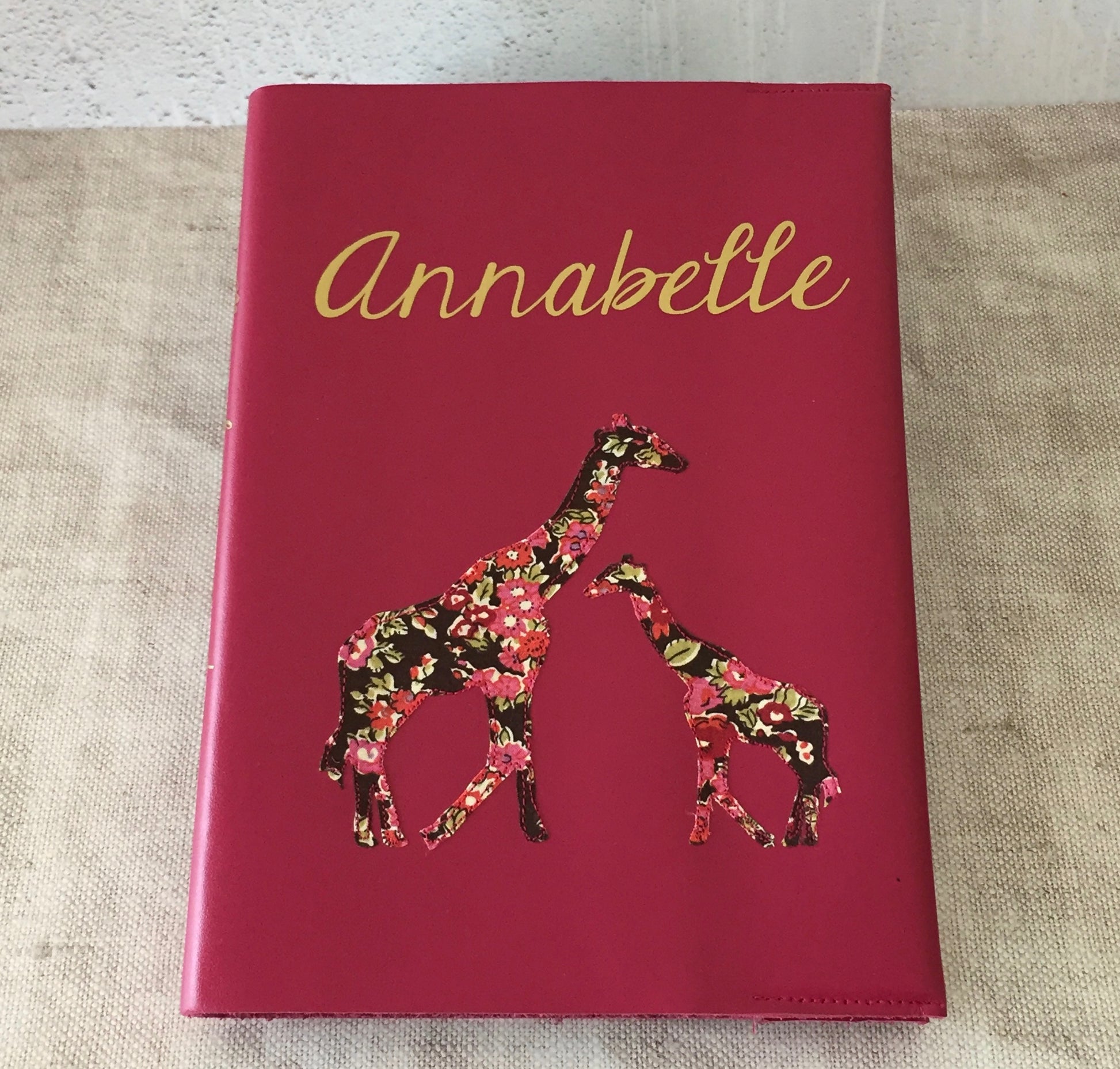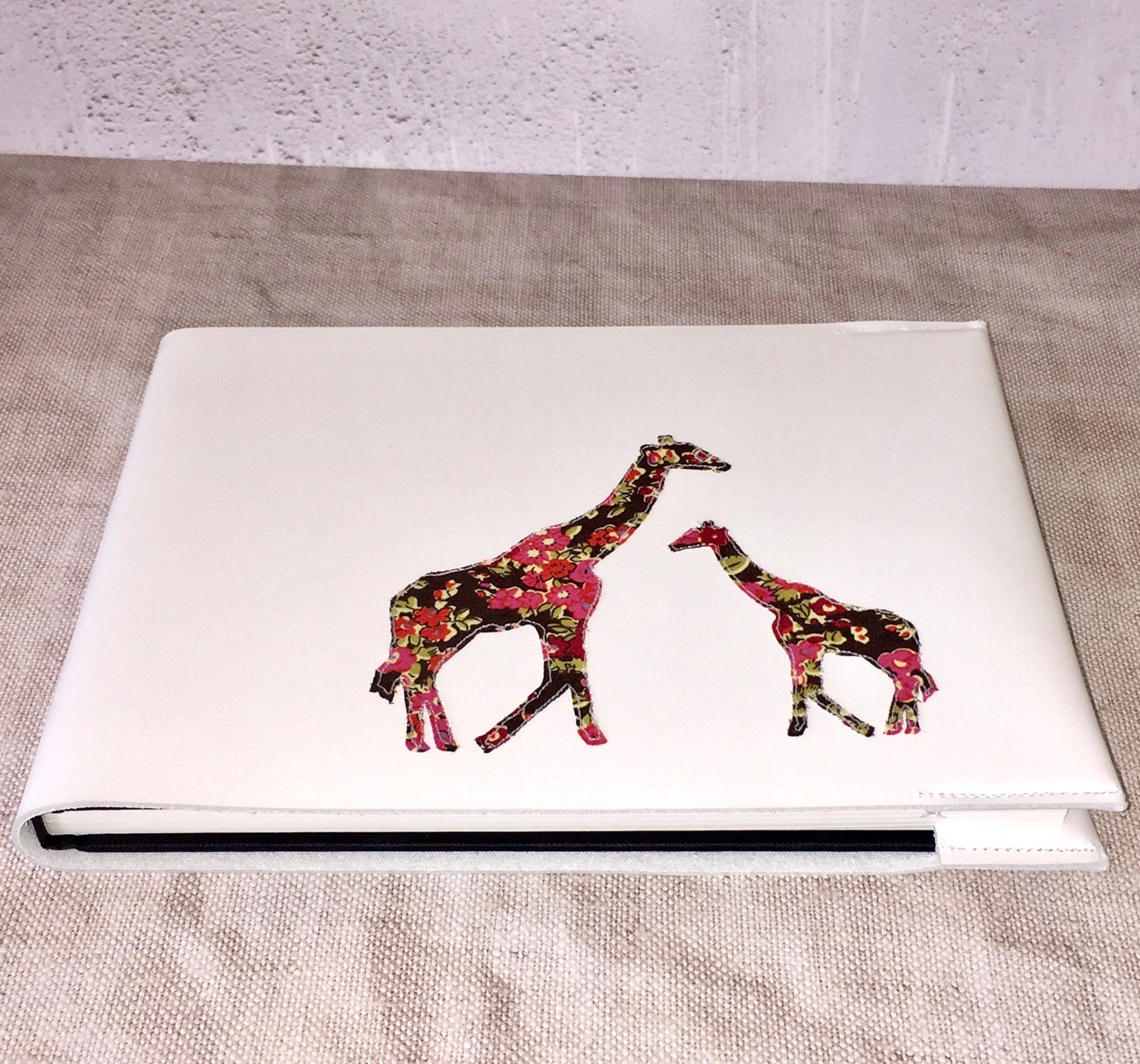 A gorgeous personalised journal, handcrafted with two stitched Liberty print Elephants or Giraffes. A wonderful gift for the new parents and baby.