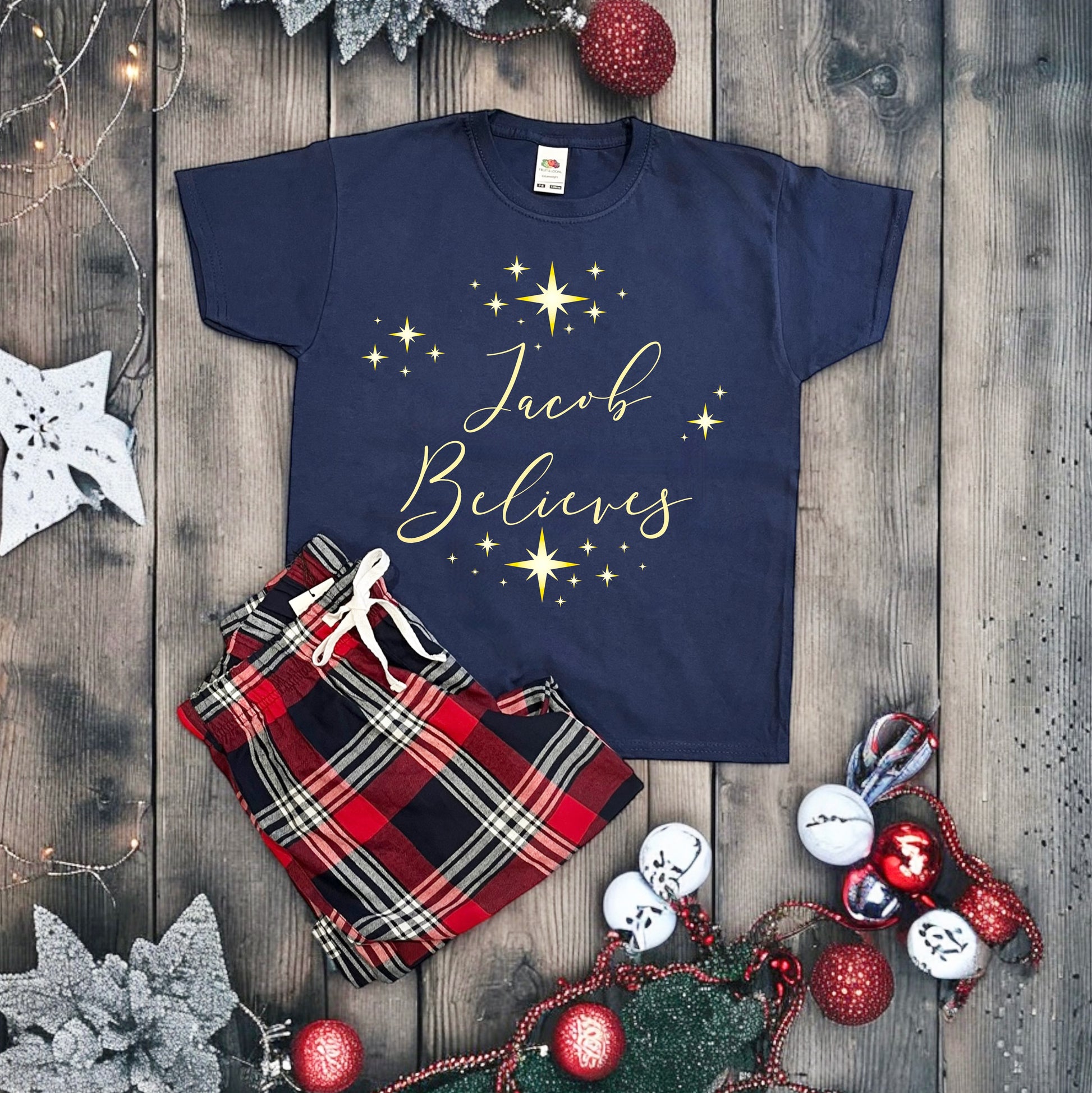 Matching Family Christmas Pyjamas to capture the Magic of Christmas. Our 'Believe' design is personalised with the recipients name that will feature in the design on the top, available in either white or gold print, this is paired with comfy tartan lounge pants, perfect for all the family.