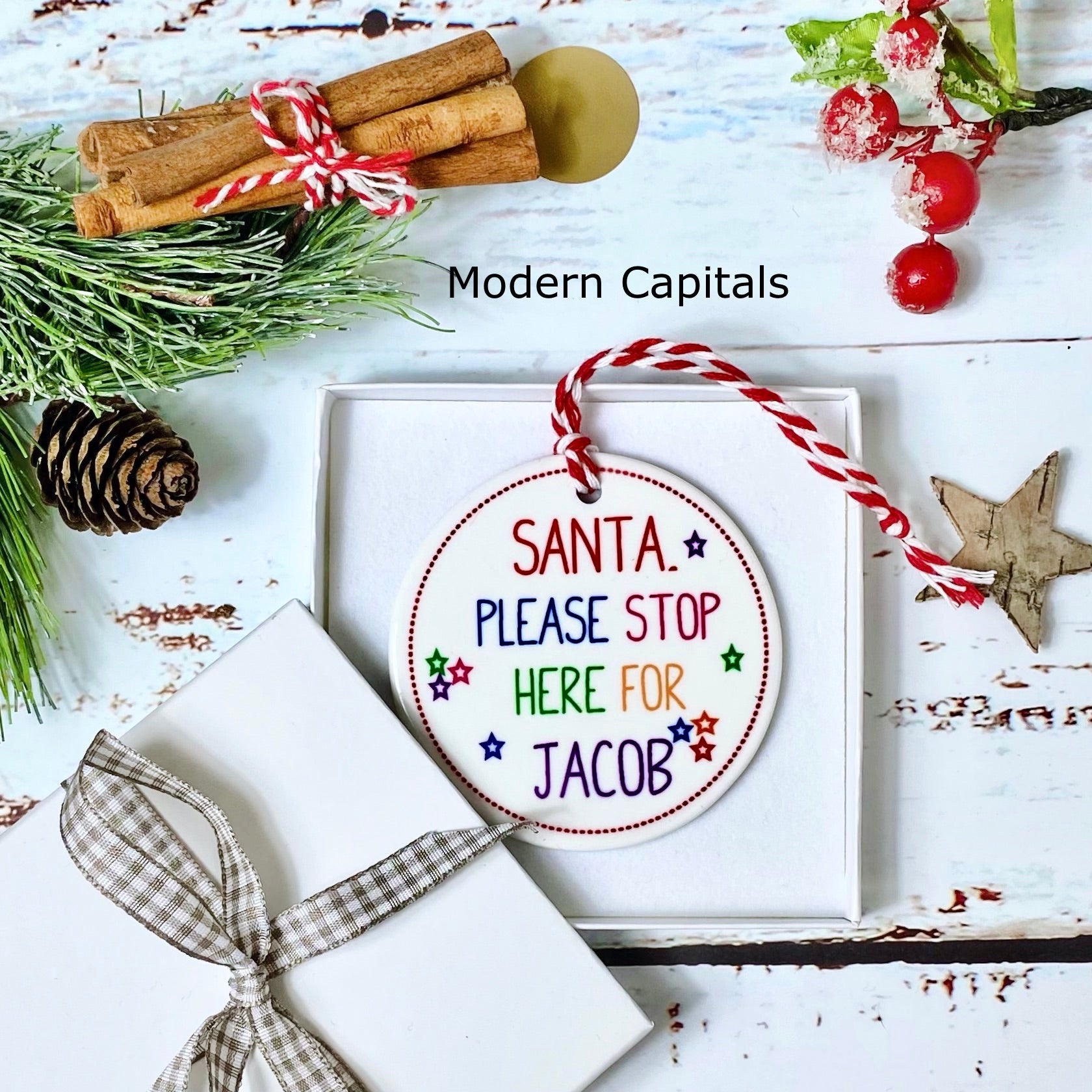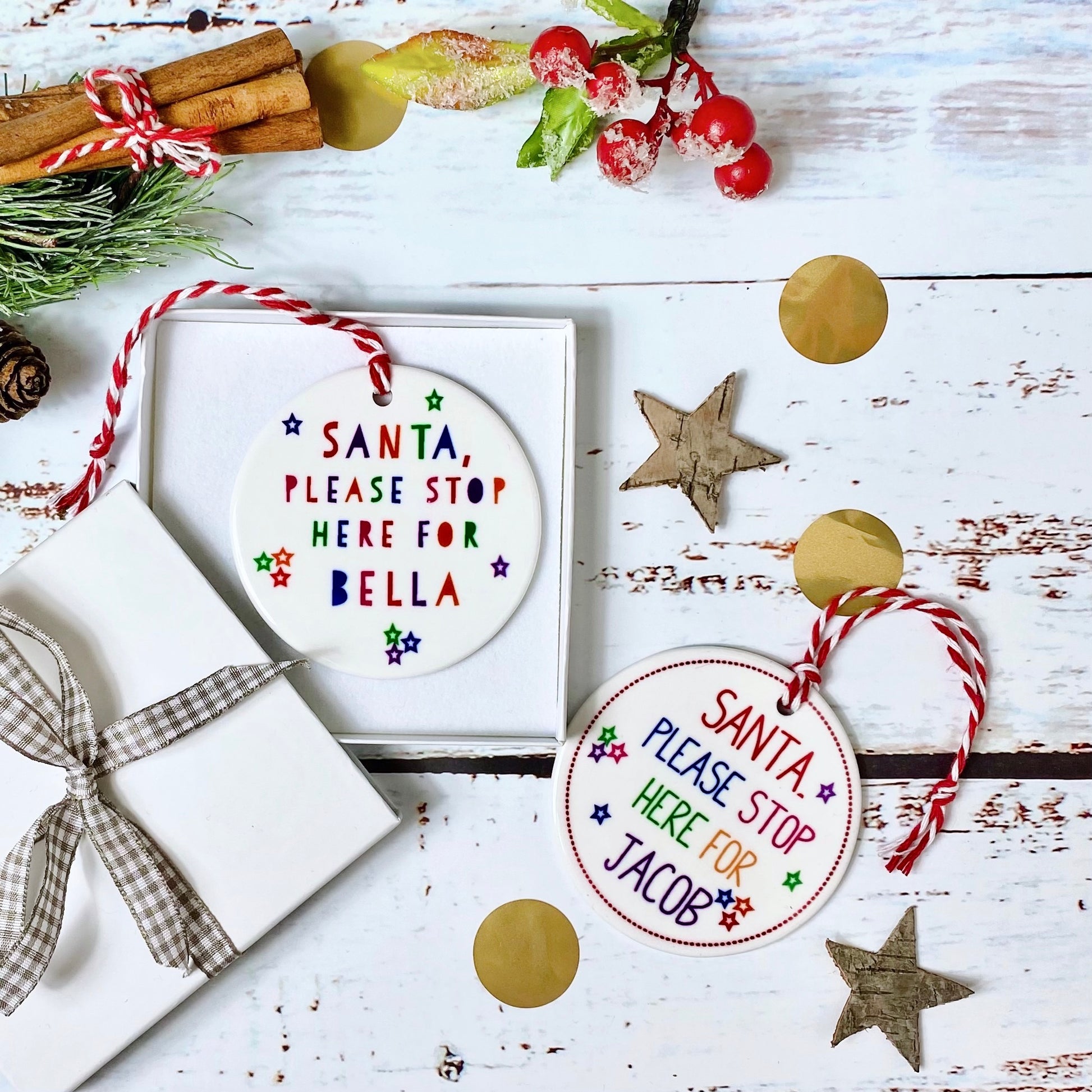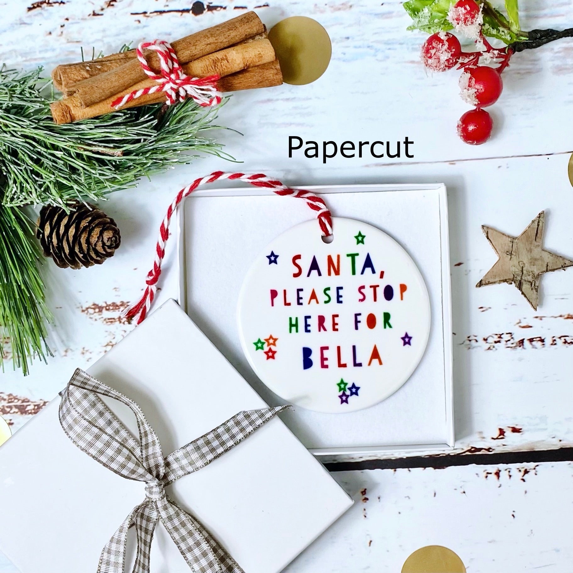 These circular decorations are made from white ceramic, and feature your choice of name, printed at the end of the phrase ‘Santa please stop here for…’. Choose from two multi-coloured fonts for the text, either our bold Paper cut style, or our Modern Capital style.