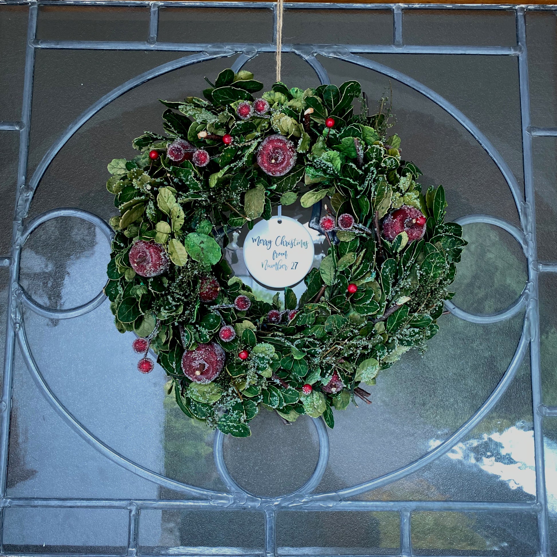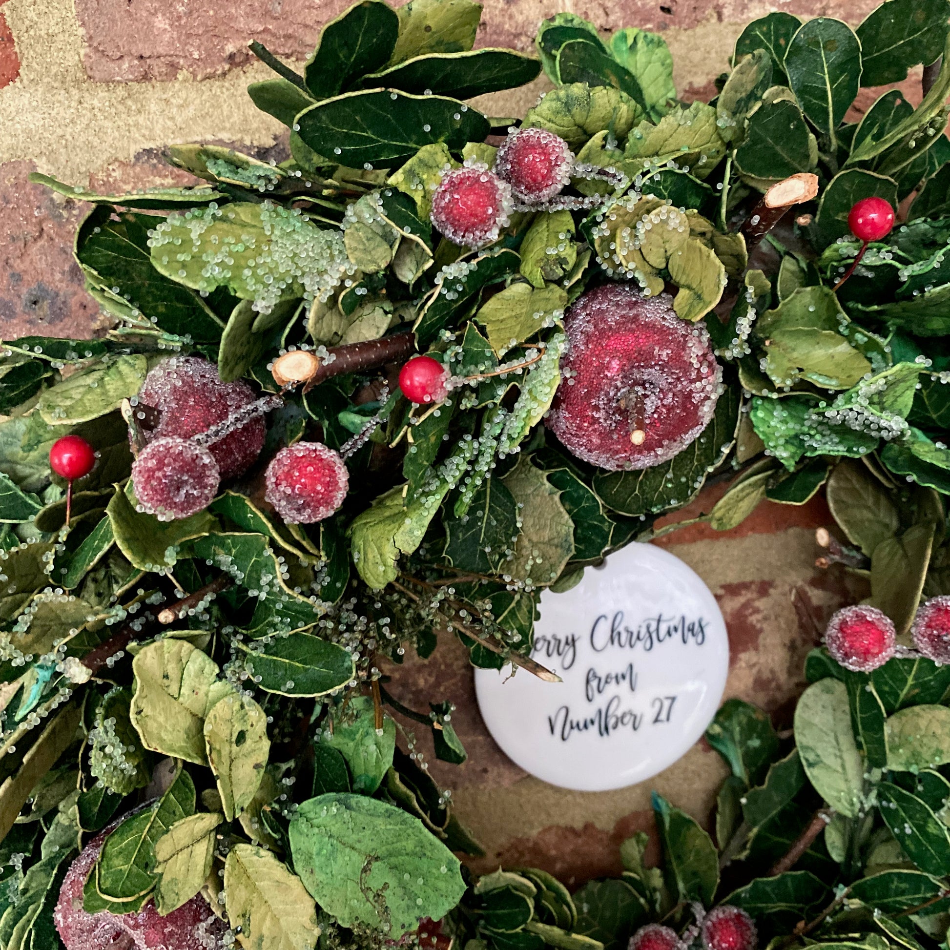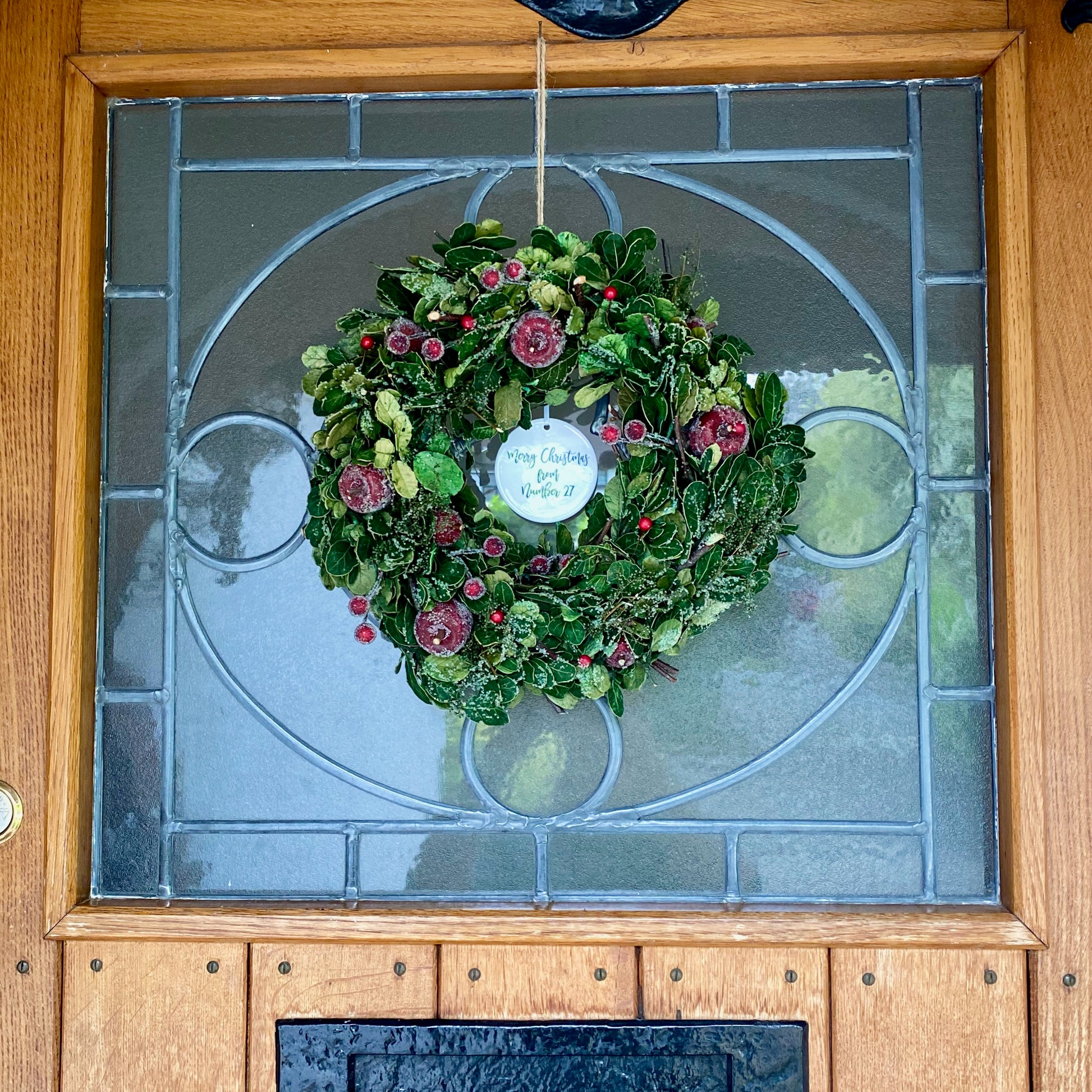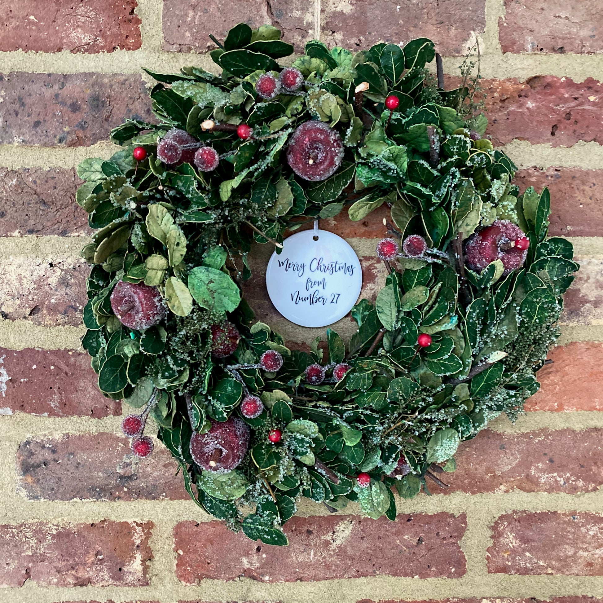 Equally suited to hanging on your front door or indoors using the attached jute string or a wreath door hanger. You can personalise the wreath with the gorgeous white ceramic plaque in the centre. Choosing either a star or a circle, you can add a message of your choice - the house name/number, family name or a message of Christmas wishes - which we will print in black.