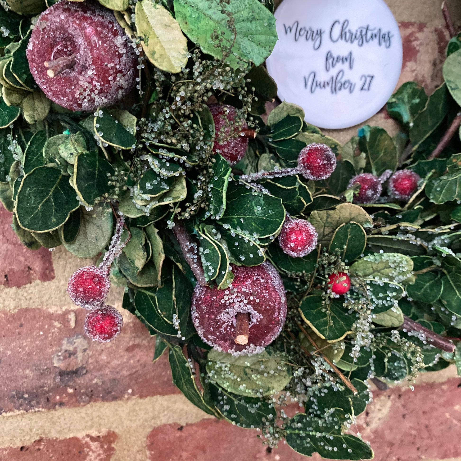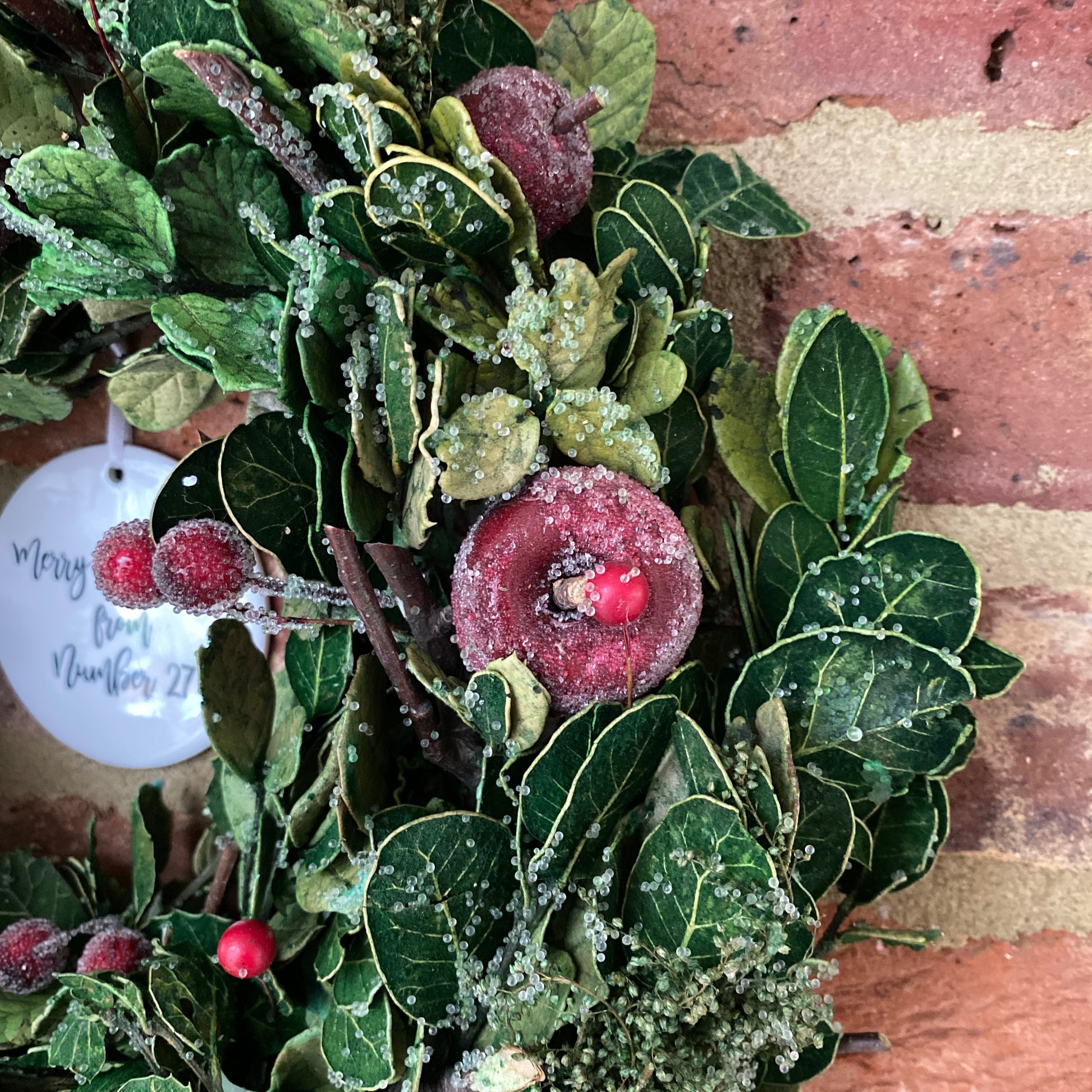 Our lovely Festive Forest wreath features a mix of dried and artificial foliage, red berries and red apples. It is finished with a sprinkling of sparkling clear glitter for a frosted look.