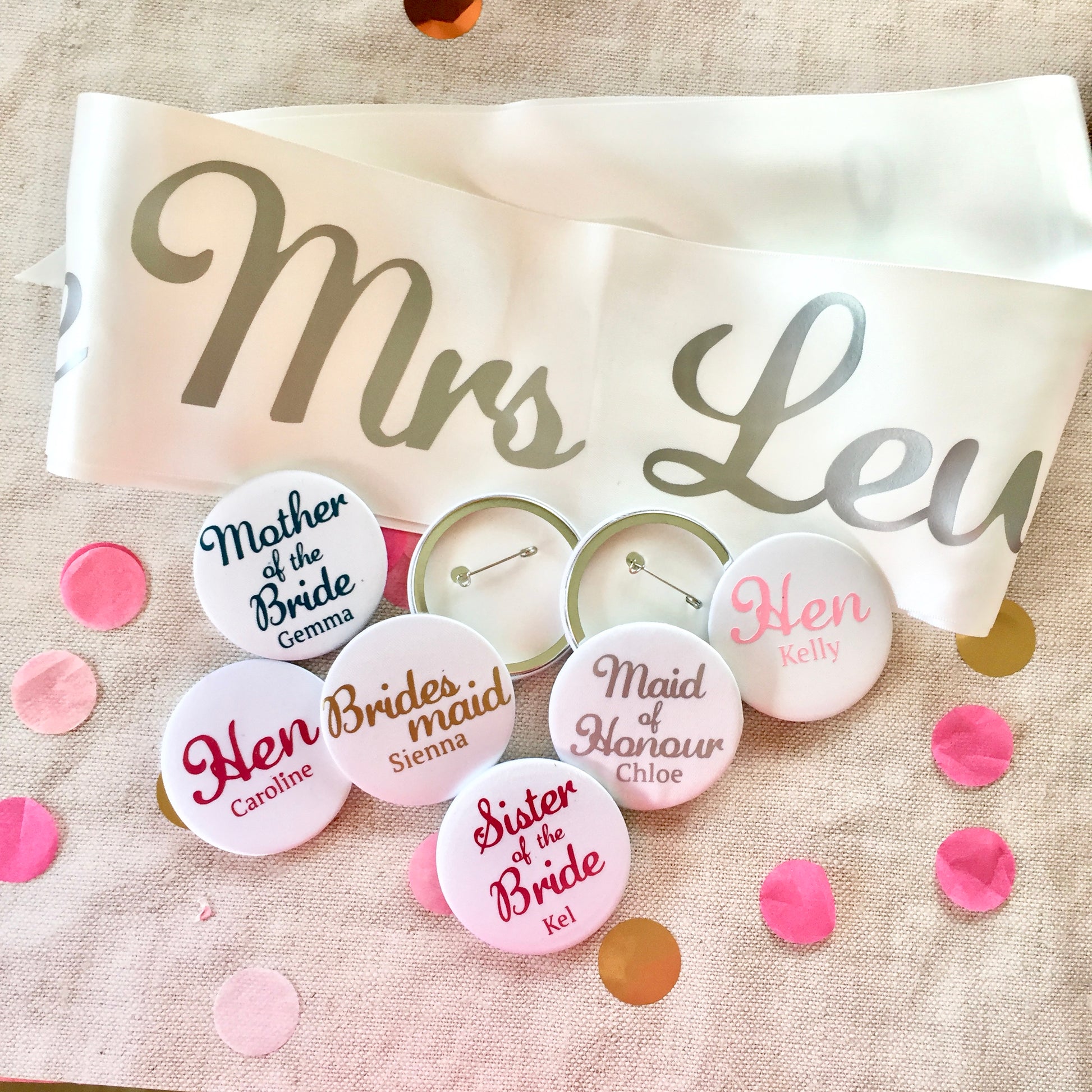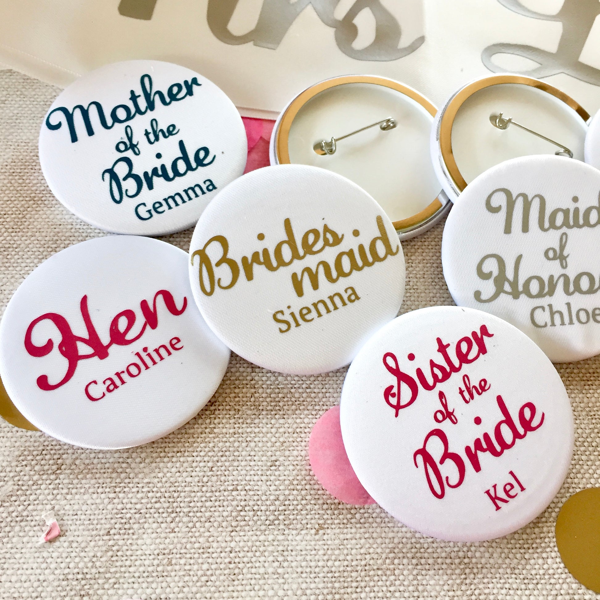 Choose from titles such as Bridesmaid, Maid of Honour, Mother of the Bride, Mother of the Groom, Sister of the Bride, Sister in law, Soon to be Sister in Law or simply Hen.