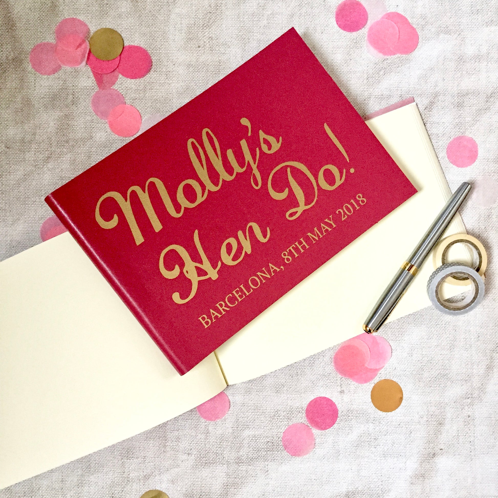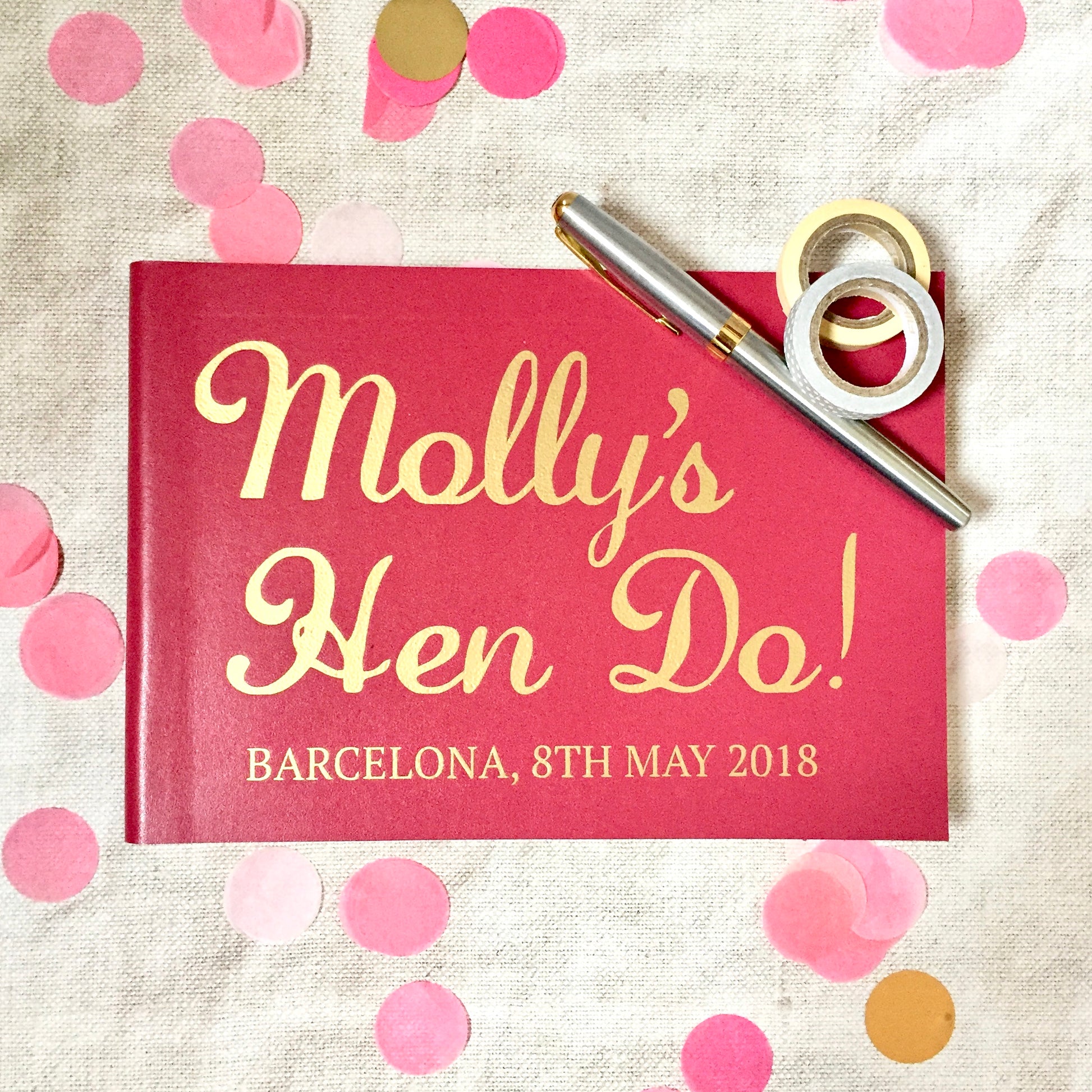 You will personalise the journal with your Hen's name on the front, the place you're celebrating and the date. On the spine is the message "With love from your Hens x”, but if you would prefer something else just let us know.